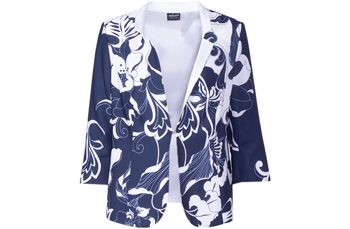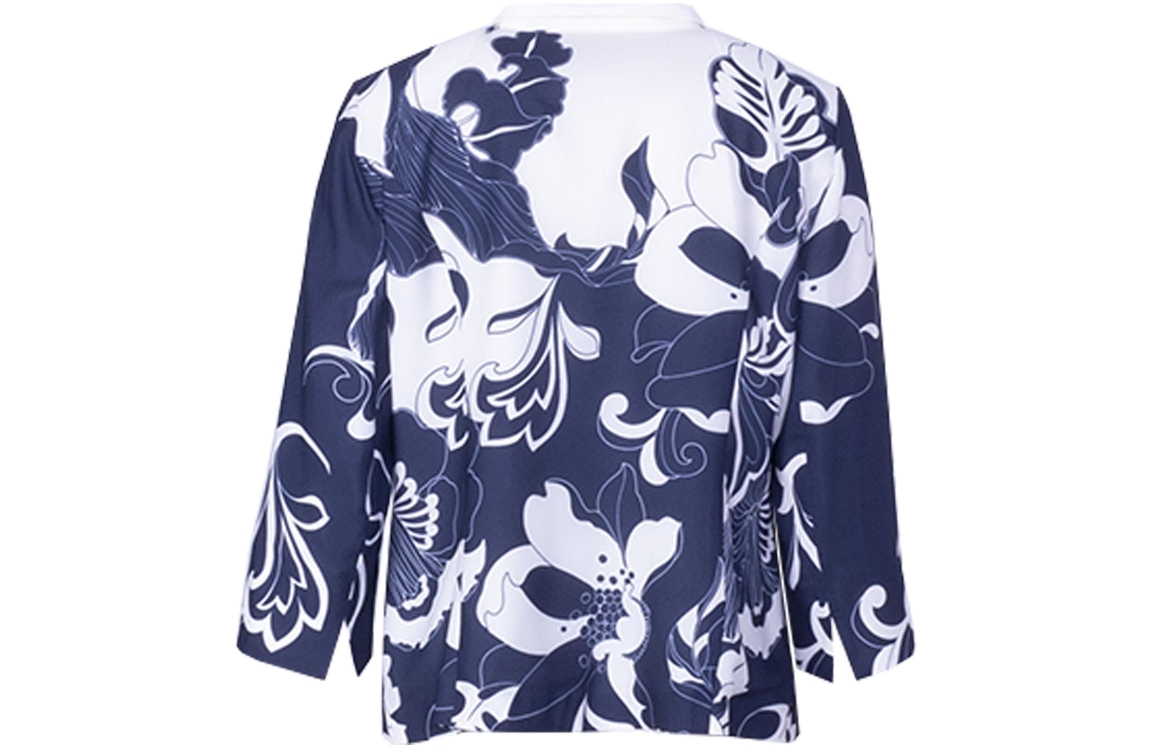 Hermann Lange jasje 2221 7368. Dit rechtvallend model heeft een laag opstaande kraag en driekwart mouwen. Dit donkerblauwe jasje van Hermann Lange is all-over bewerkt met een grafische print in de kleur off white.