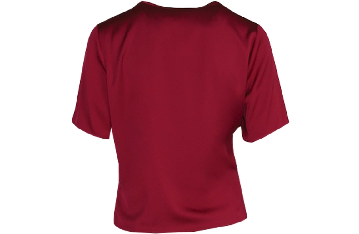 Hermann Lange top 5428-1165. Dit rechtvallend model heeft een ronde hals en korte mouwen. Deze rode top van Hermann Lange heeft een all-over satijnen-look en is afgewerkt met plooitdetails bij de hals.