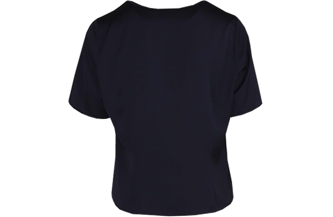 Hermann Lange top 5428-1165. Dit rechtvallend model heeft een ronde hals en korte mouwen. Deze donkerblauwe top van Hermann Lange heeft een all-over satijnen-look en is afgewerkt met plooitdetails bij de hals.