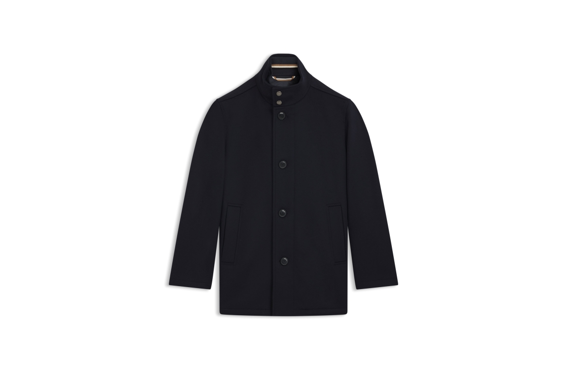 Hugo Boss jas 50549193 404. Dit regular fit model heeft een opstaande kraag en lange mouwen. Deze donkerblauwe jas van Hugo Boss sluit aan de voorzijde door middel van een knoop- en ritssluiting en is voorzien van twee steekzakken.