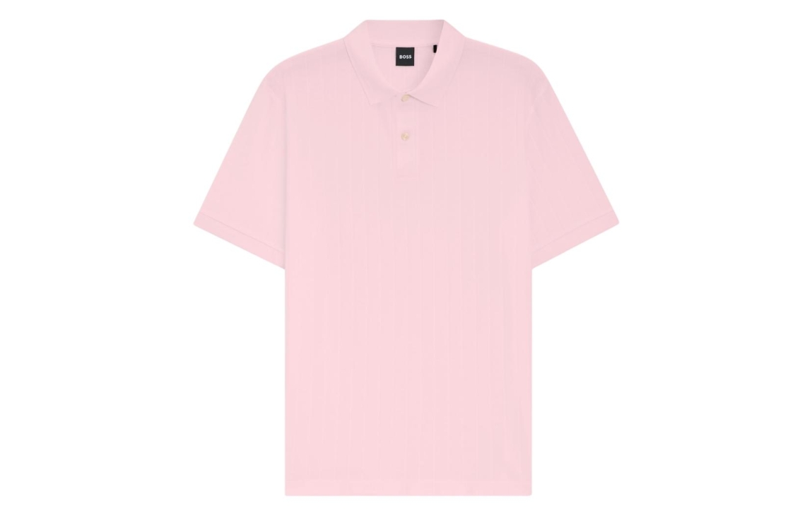 Hugo Boss black polo H-Parlay 50559609. Dit rechtvallend model heeft een kraag met knopen en korte mouwen. Deze roze polo van hugo Boss is voorzien van een geweven strepen patroon en uitgevoerd in een stevig materiaal.