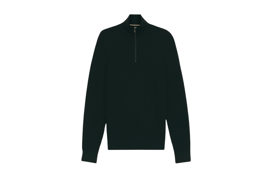 Hugo Boss-Black H-Ulicio 10276796 01 348 Open green. Dit rechtvallende model heeft een opstaande kraag met ritssluiting en lange mouwen. Deze donkergroene pullover van Hugo Boss is uitgevoerd in een structuur en is afgewerkt met ribgebreide boorden