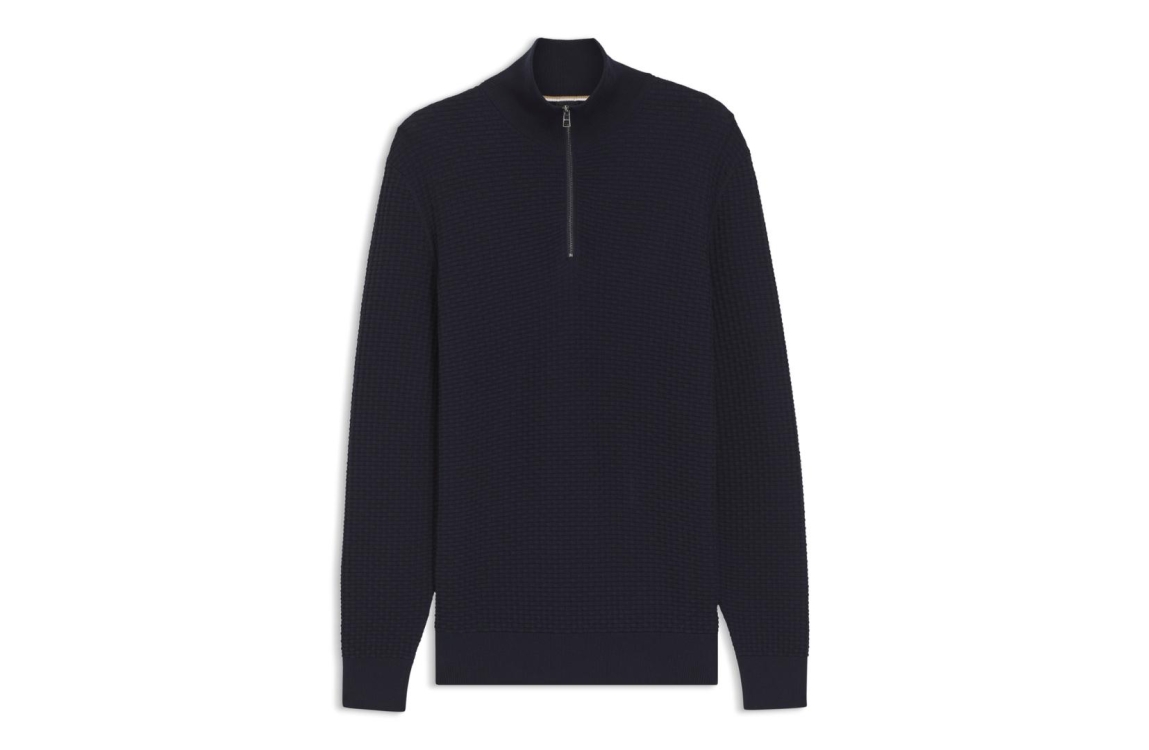 Hugo Boss-Black pullover 50555118. Dit rechtvallend model heeft een turtle neck met zip en lange mouwen. Deze donkerblauwe pullover van Hugo Boss is uitgevoerd in een geweven materiaal.