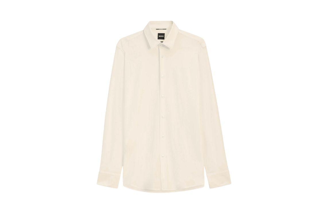 Hugo Boss-Black P-HANK-S-K-261 10277424 0. Dit rechtvallende model heeft een kraag en lange mouwen. Deze beige overhemd van Hugo Boss sluit door middel van knopen en is uitgevoerd in stretchkwaliteit.