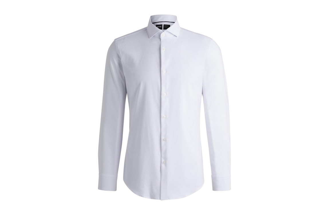 Hugo Boss overhemd 50520056. Dit slimfit model is voorzien van een kraag en heeft lange mouwen. Dit witte overhemd van Hugo Boss sluit door middel van knopen en is bewerkt met een zigzag patroon. Dit model bevat stretch en is ademend.
