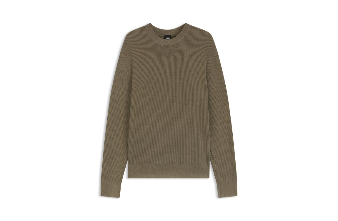 Hugo Boss pullover 50549989 245. Dit rechtvallende model heeft een ronde halslijn en lange mouwen. Deze groene/bruine pullover van Hugo Boss is uitgevoerd in ribkwaliteit en heeft afgewerkte boorden.