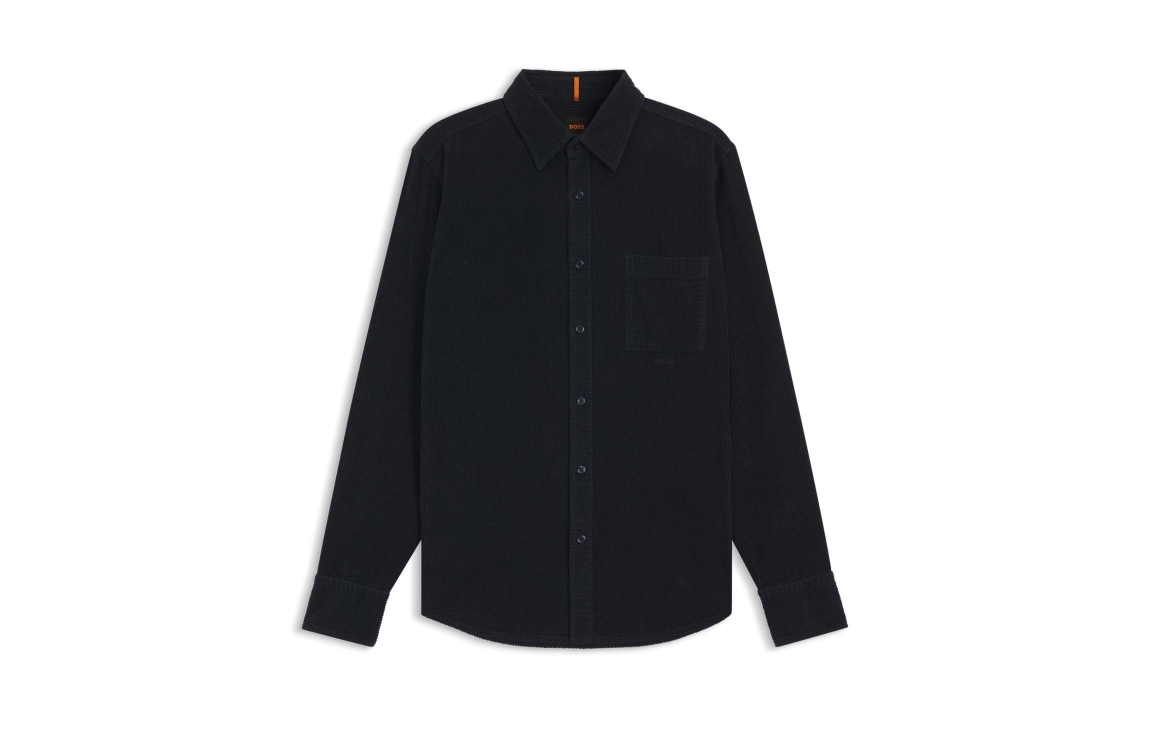 Hugo Boss Relegant_6_M 10260285 02 404 Dark blue. Dit rechtvallende model heeft lange mouwen en een kraag. Dit donker blauwe overshirt van Hugo Boss heeft 1 steekzak op de borst en is gemaakt van ribfluweel materiaal.
