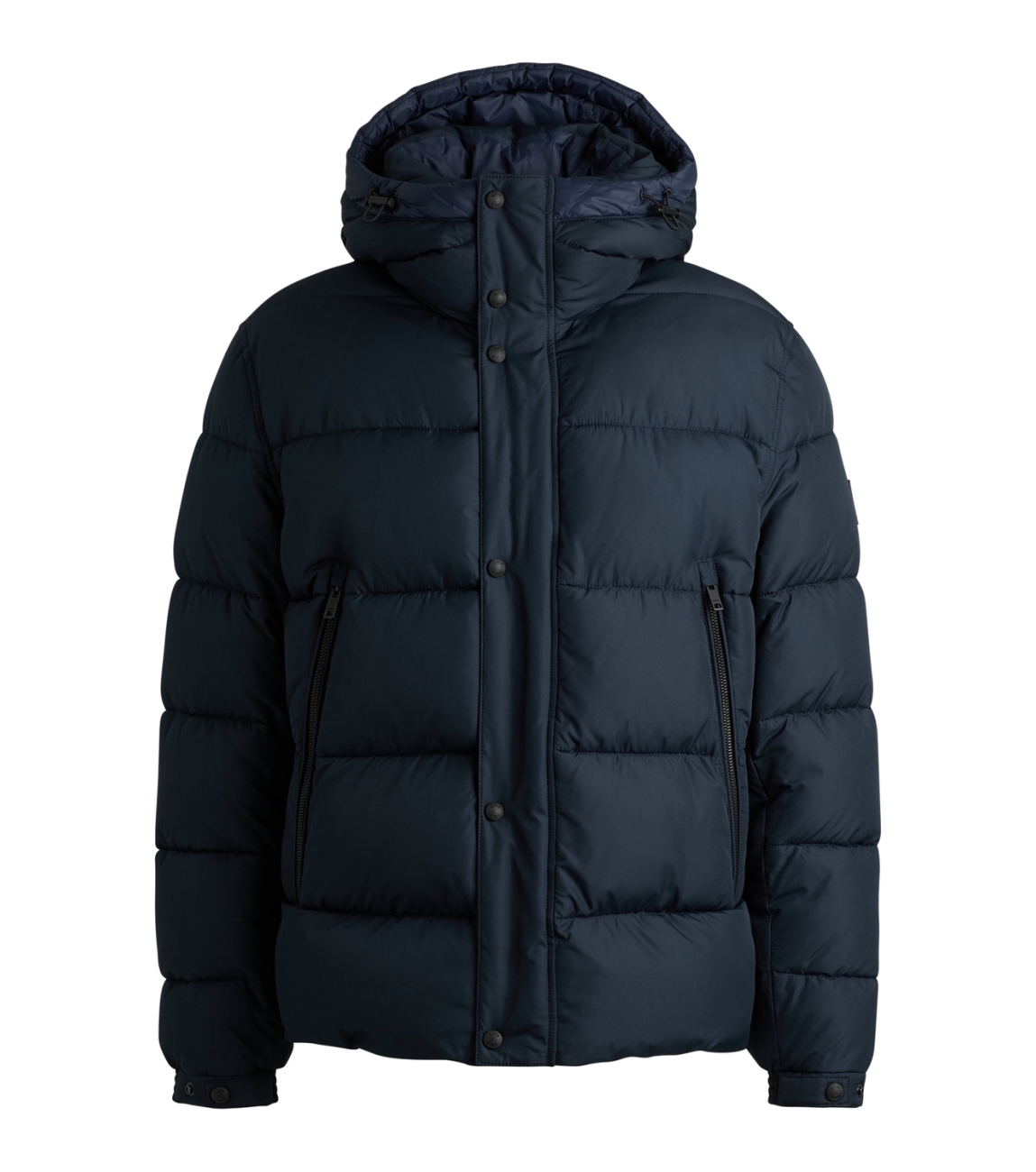 Hugo Boss jas 50528573 404. Dit regular fit model heeft een capuchon en lange mouwen. Deze donkerblauwe jas van Hugo Boss sluit aan de voorzijde door middel van een ritssluiting met knopen is voorzien van twee grote ritszakken.