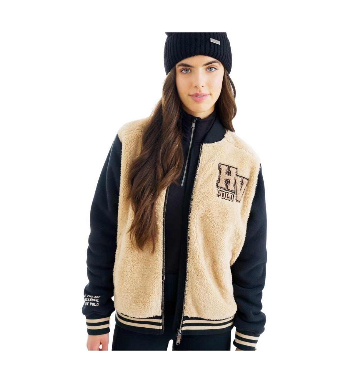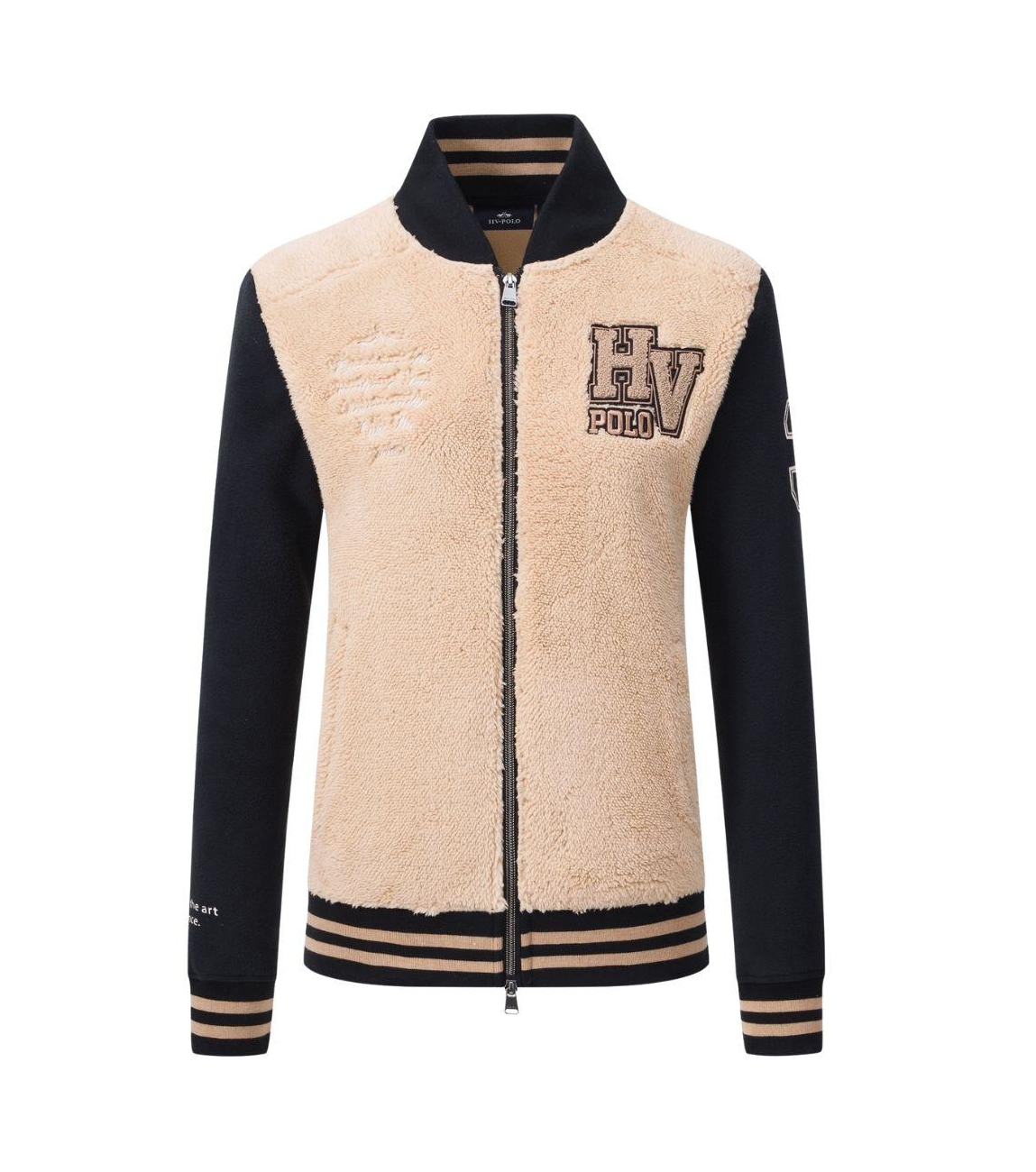 HV Polo vest Drina 0401103751. Dit rechtvallende model heeft een opstaande kraag en lange mouwen. Deze donkerblauwe vest van HV Polo sluit aan de voorzijde met een ritssluiting en is uitgevoerd in zacht lamsfleece met varsitydetails en contrasterende mouwen. Het model is op de linkerborst en de mouw gedetailleerd met het merkembleem en is afgewerkt met gestreepte boorden.