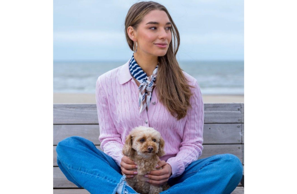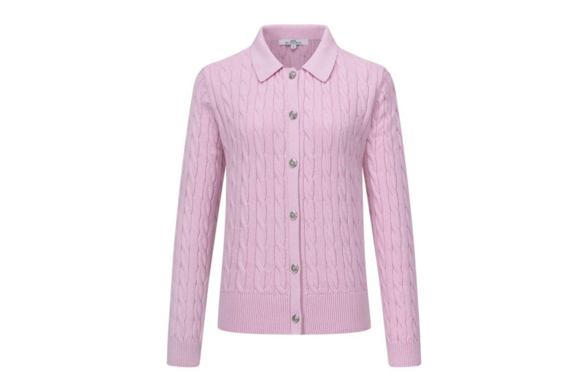 HV Polo vest 0409593806. Dit rechtvallend model is voorzien van een kraag en heeft lange mouwen. Deze roze vest van HV Polo sluit door middel van knopen en is all-over bewerkt met een kabelstructuur.