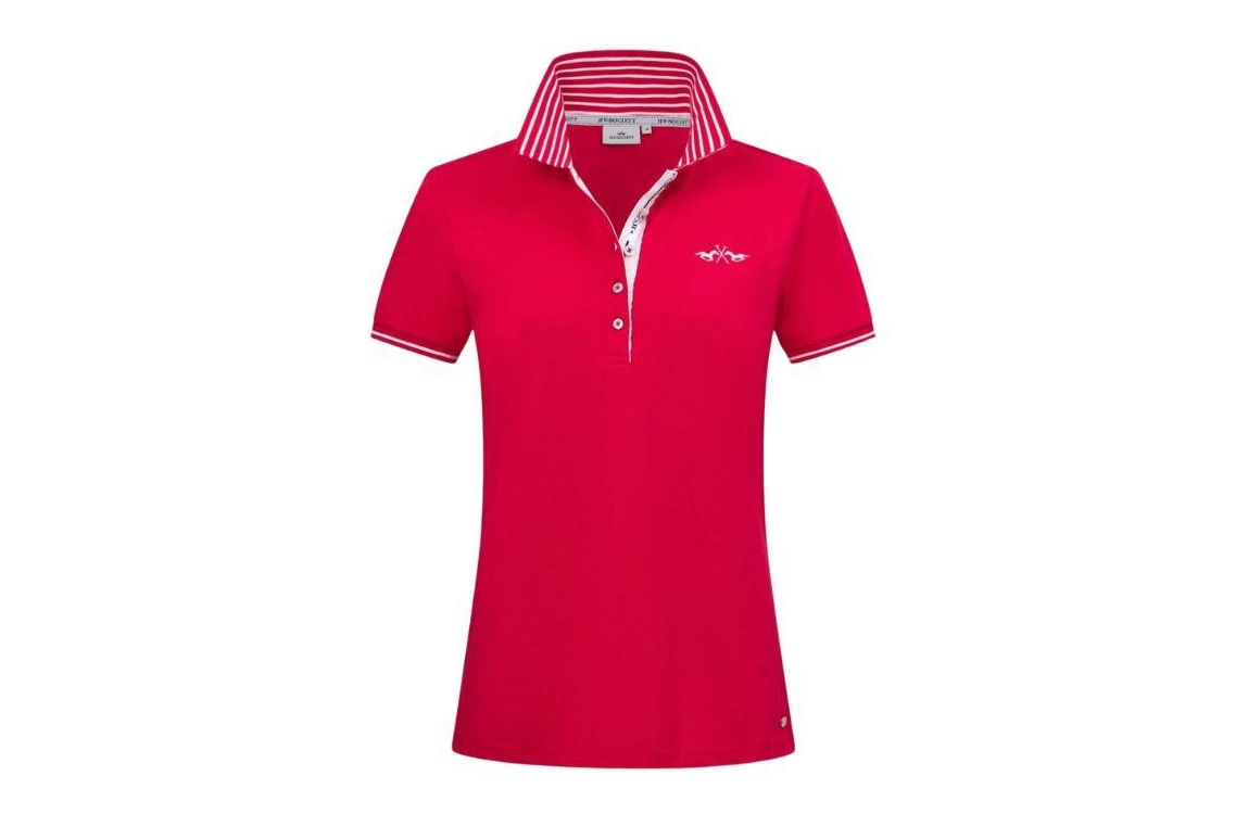 HV Polo poloshirt 0403103801. Dit rechtvallende model heeft een kraag met knoopsluitingen en korte mouwen. Deze roodkleurige poloshirt van HV Polo is op de linkerborst gedetailleerd met het merkembleem en is afgewerkt met gestreepte boorden.