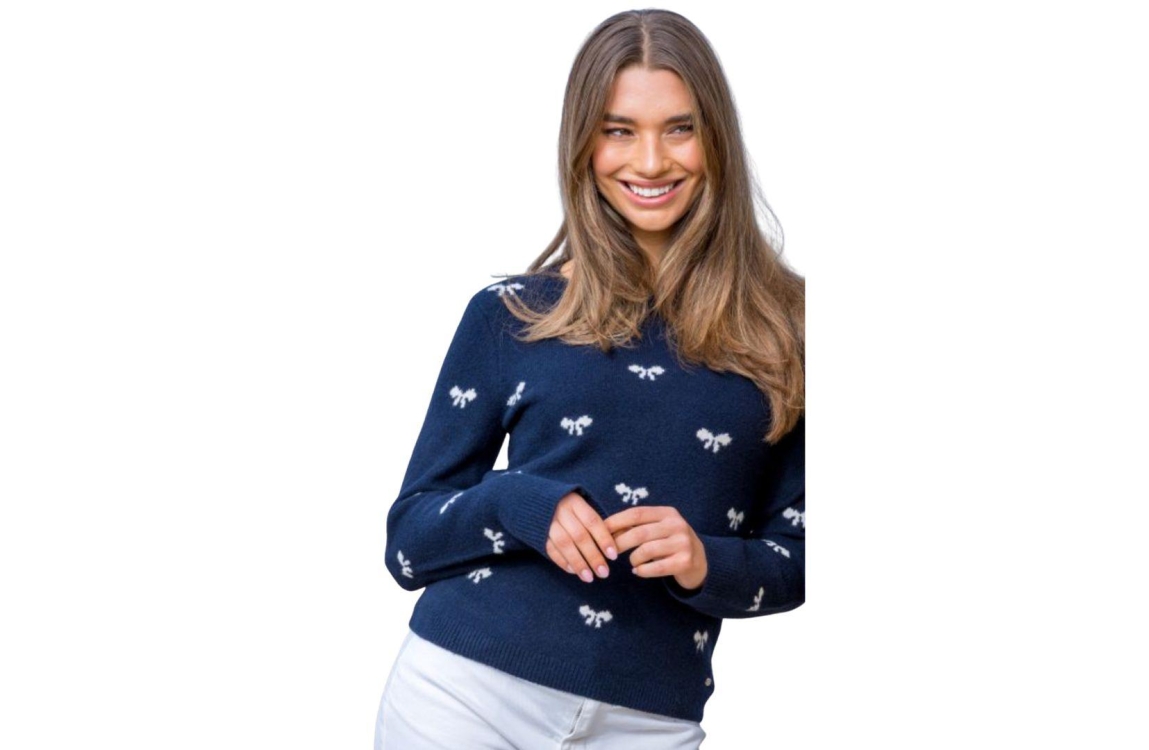 HV Polo pullover 0409593802. Dit rechtvallend model is voorzien van een ronde hals en heeft lange mouwen. Deze donkerblauwe pullover van HV Polo is allover bewerkt met witte strikjes.