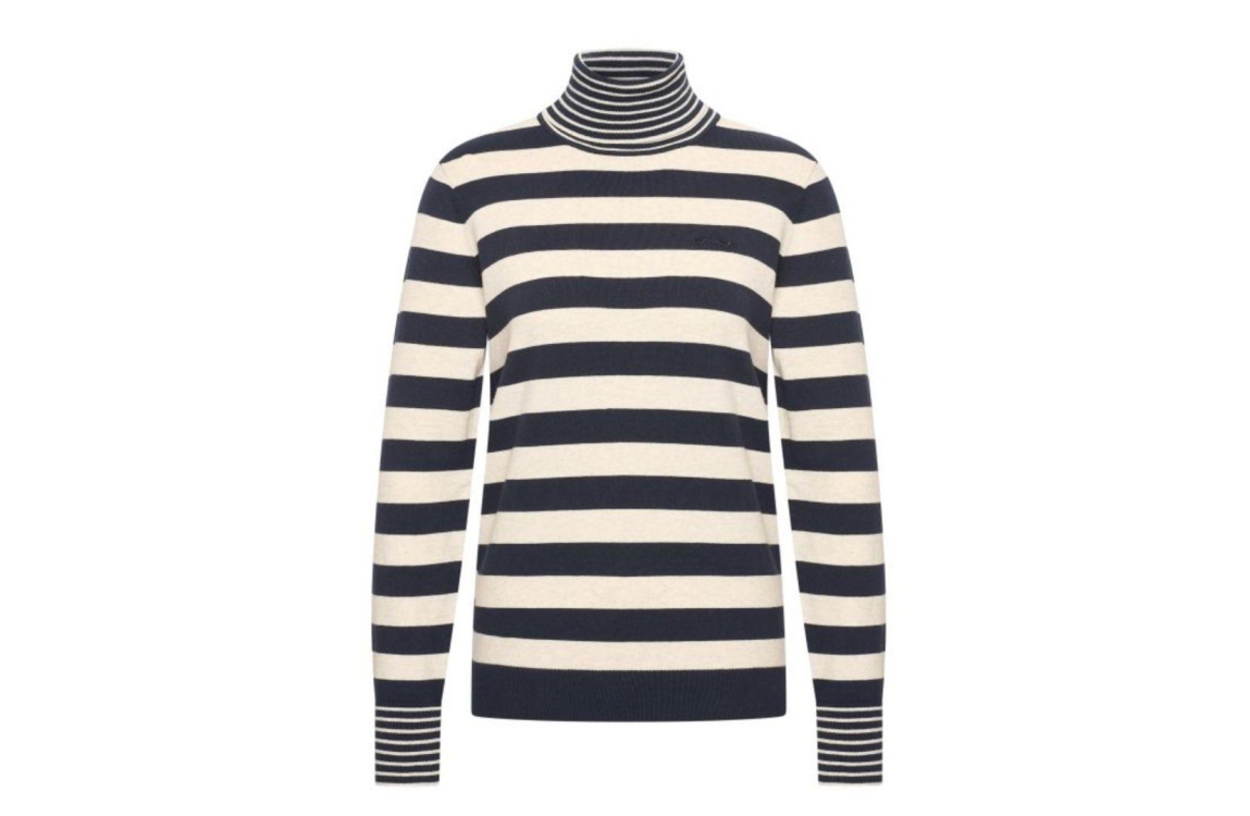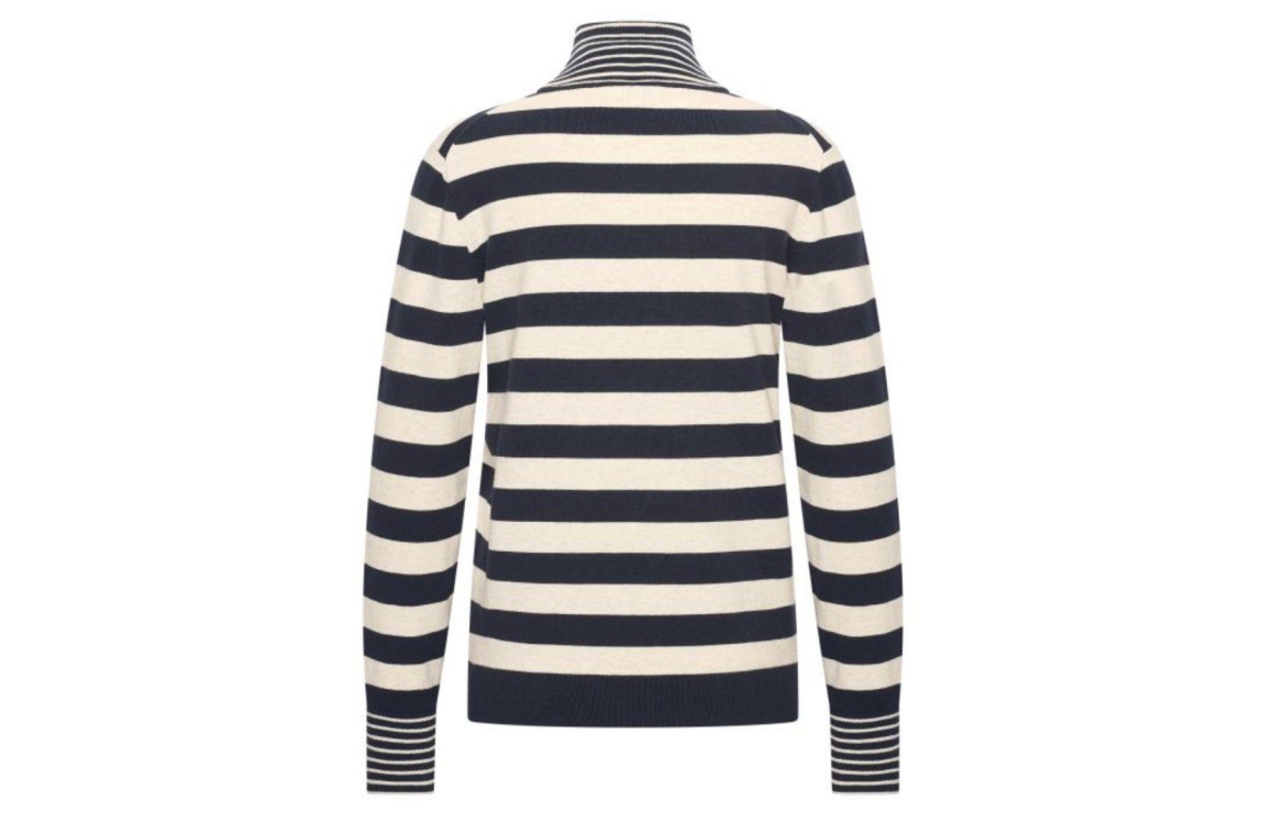 HV Polo HVSPatrizia 0409103757. Dit rechtvallend model is voorzien van een col en heeft lange mouwen. Deze donkerblauwe/beige pullover van HV Polo is bewerkt met strepen.