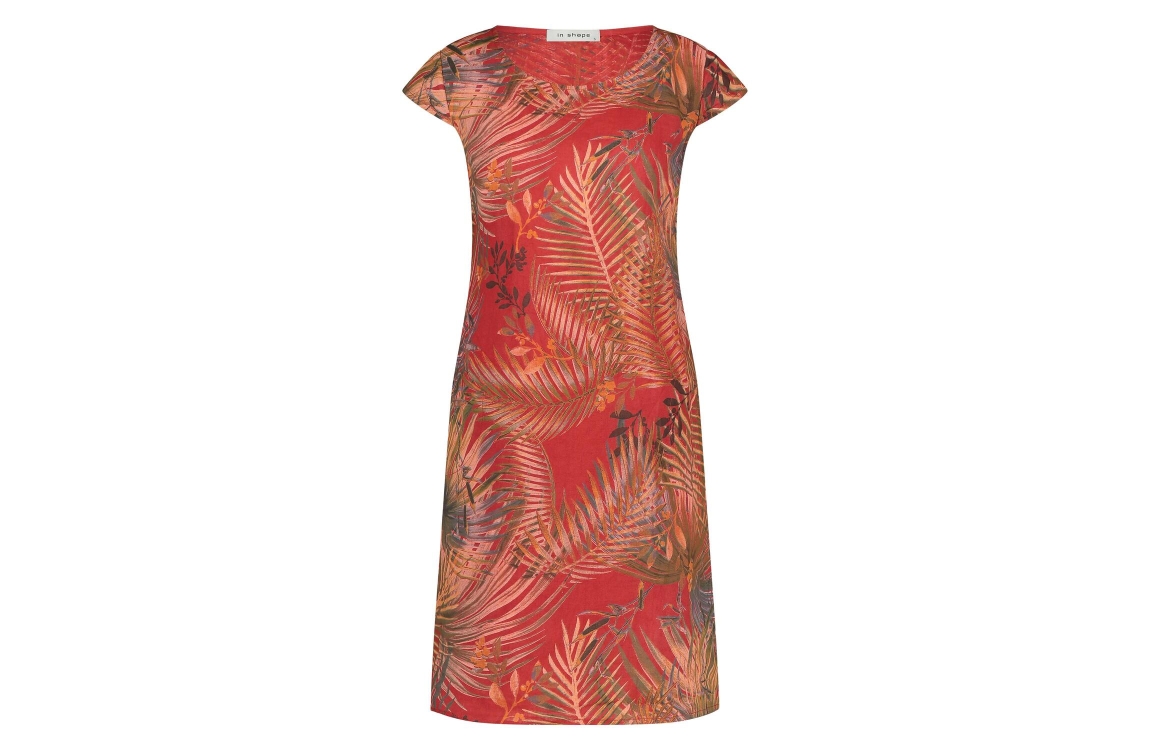 In Shape jurk Fien Flower INS2501087. Dit rechtvallend model is voorzien van een ronde hals, heeft korte mouwen en steekzakken. Deze rode jurk van In Shape is bewerkt met een blad print.