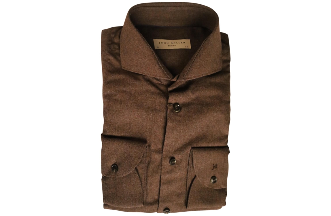 John Miller 4026s 3/324 sf 5. Dit slim fit model is voorzien van een button down kraag en heeft lange mouwen afgewerkt met een split en knoop. Dit donkerbruin overhemd van John Miller sluit aan de voorzijde door middel van knopen een heeft initialen op het linker manchet.