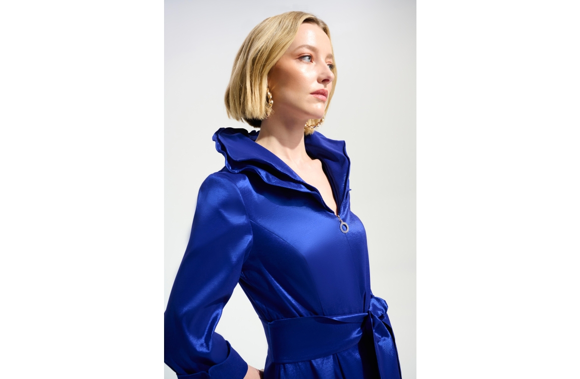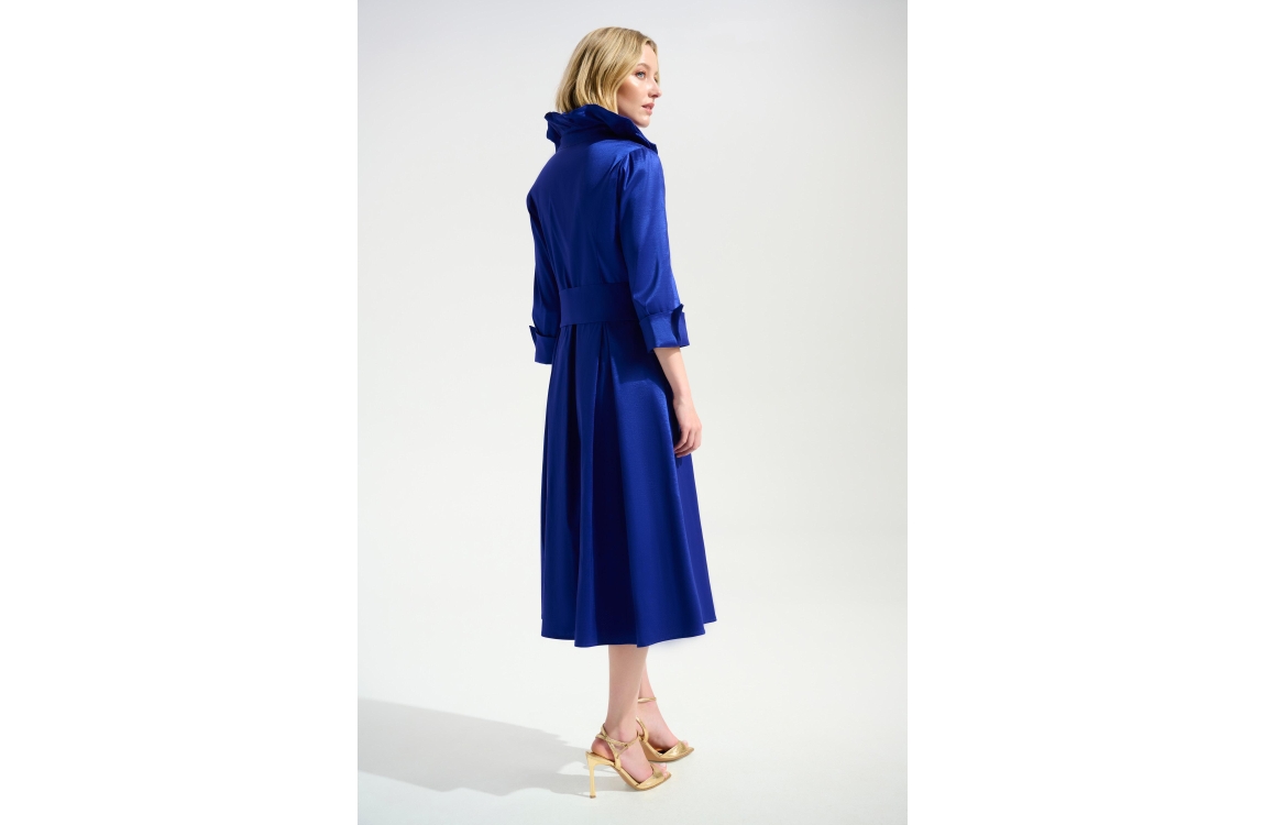 Joseph Ribkoff 261719 jurk. Dit a-lijn model heeft een v-hals met openstaande kraag en driekwart mouwen. Deze blauwe jurk van Joseph Ribkoff sluit door middel van een rits en is uitgevoerd in een stevig materiaal. Dit model beschikt over subtiele roezels aan de bovenzijde, een breed ceintuur in de taille en loopt uit met plooien.