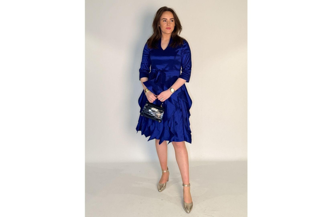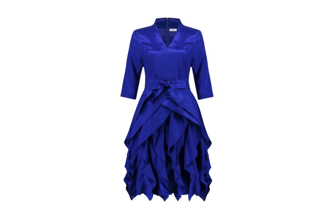 Joseph Ribkoff jurk 261741. Dit rechtvallend model is voorzien van een ronde hals met v-inkeping en heeft driekwart mouwen. Deze blauwe jurk van Joseph Ribkoff sluit aan de achterzijde door middel van een rits en een afneembaar ceintuur. Dit model is bewerkt met volants aan de onderzijde