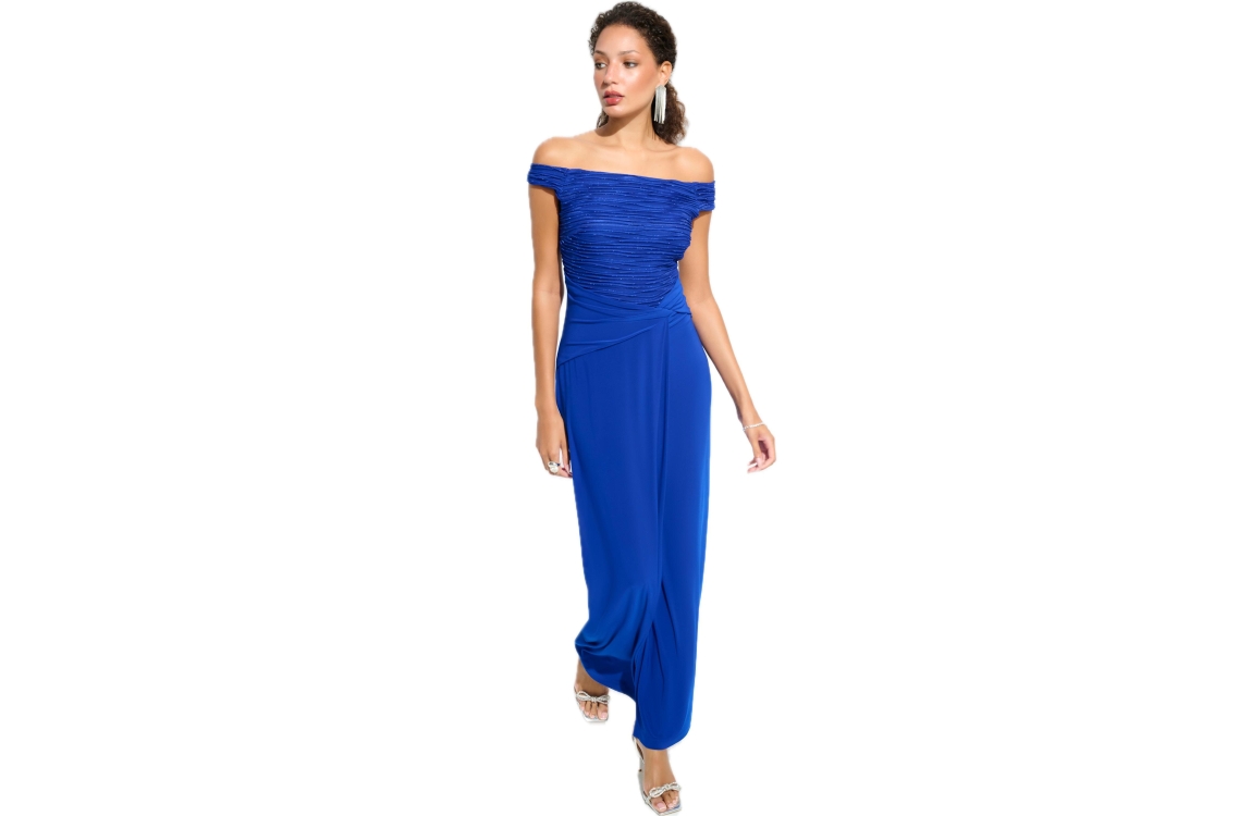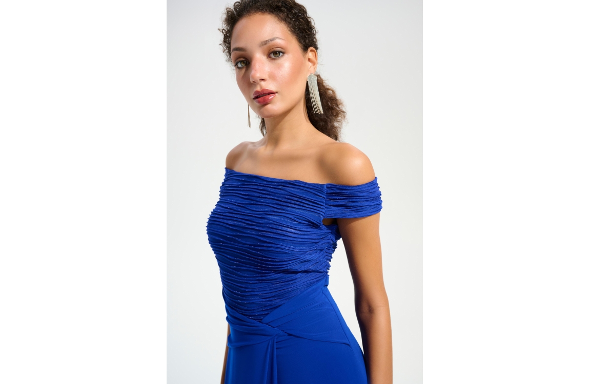 Joseph Ribkoff LDS Dress 2922 Royal Sapphire. Dit aangesloten model heeft een wijde hals en korte mouwen. Deze donkerblauwe jurk van Joseph Ribkoff is bewerkt met glitters aan de bovenzijde en heeft een gedrappeerd detail in de taille. De jurk sluit door middel van een rits aan de achterzijde.