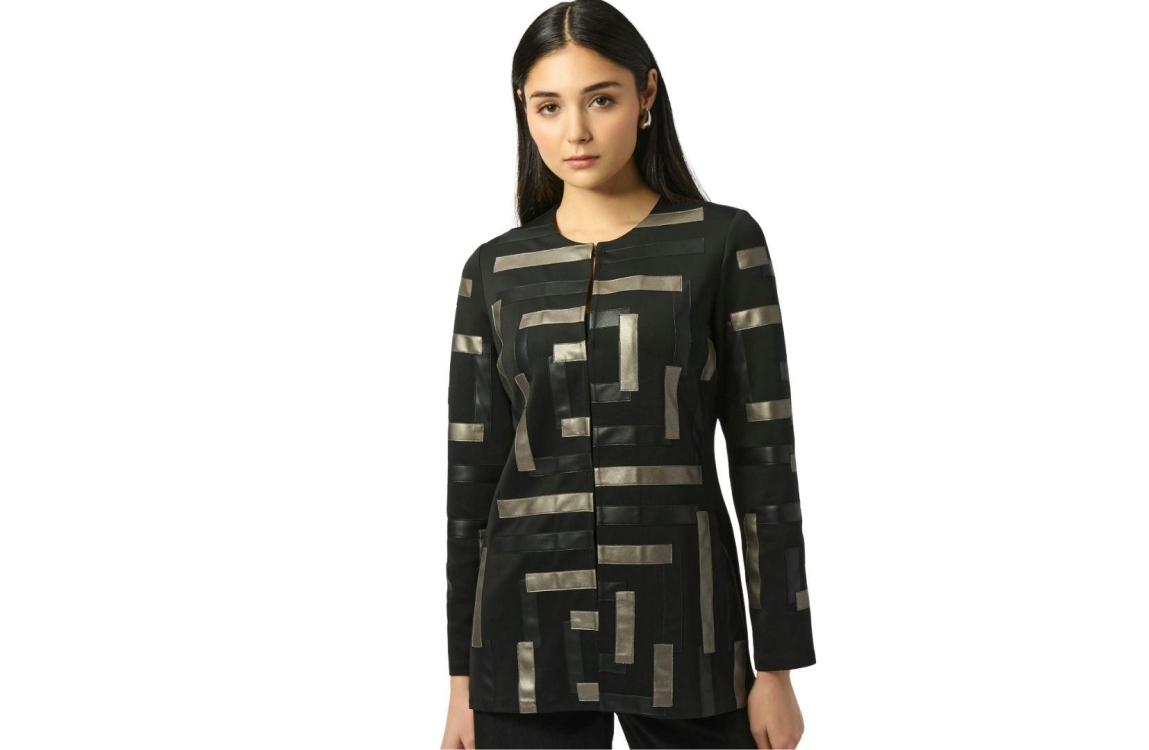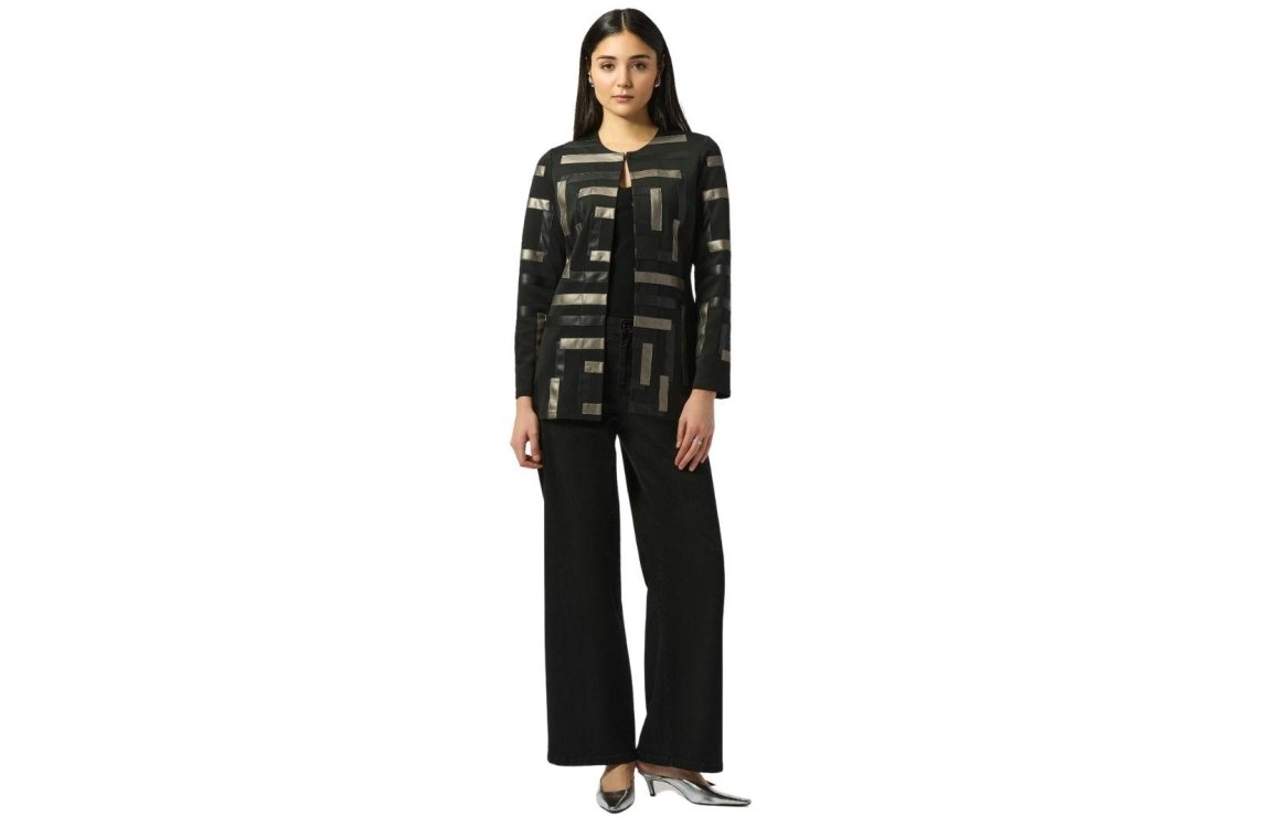 Joseph Ribkoff 253929. Dit rechtvallend model heeft een ronde hals en lange mouwen. Deze zwarte jas van Joseph Ribkoff is all-over bewerkt met een glimmende streepprint en sluit aan de voorzijde door middel van haak- en oogknopen.