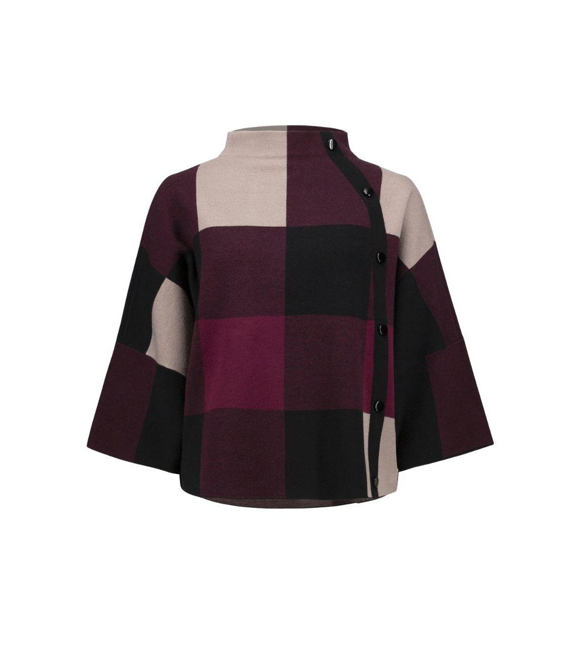 Joseph Ribkoff trui 243948F25. Dit rechtvallend model is voorzien van een turtle neck en heeft driekwart mouwen. Deze bordeauxrode/zwarte en beige trui van Joseph Ribkoff is bewerkt met vlakken en is afgewerkt met decoratieve knopen aan een zijde.