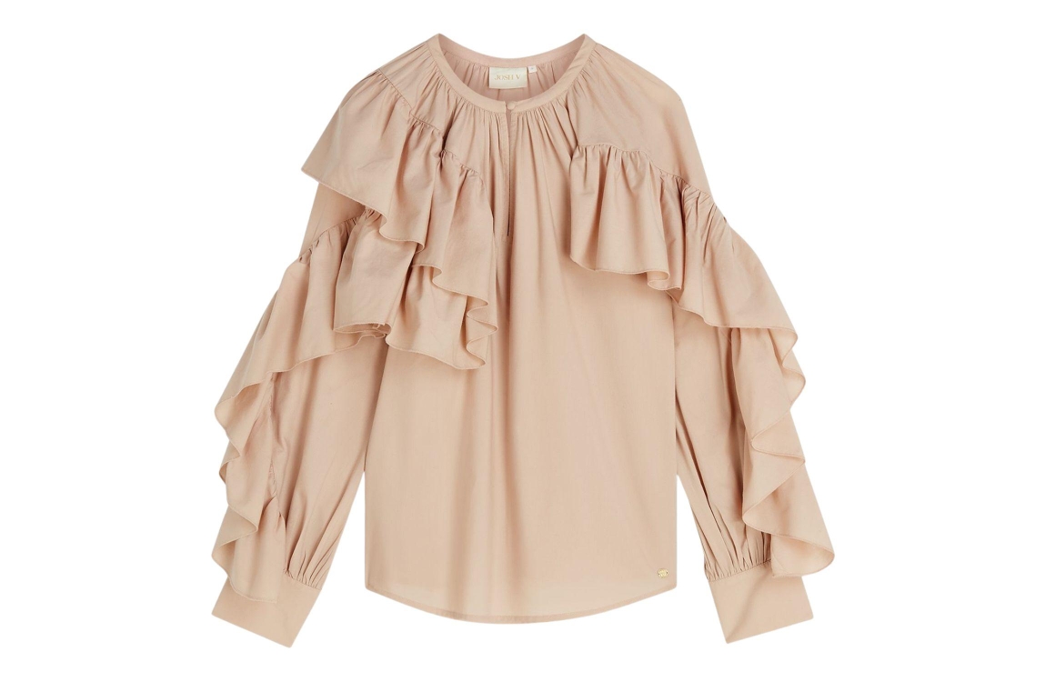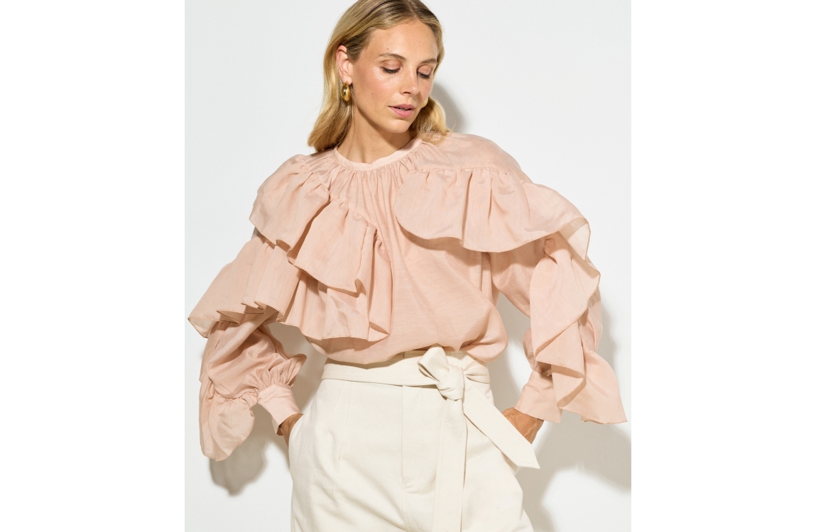 Josh V BODINA regular fit blouse 813 dusty pink. Dit rechtvallende model is voorzien van een ronde hals met knoopje en heeft lange mouwen. Deze lichtroze blouse van Josh V is all-over bewerkt met ruffles.