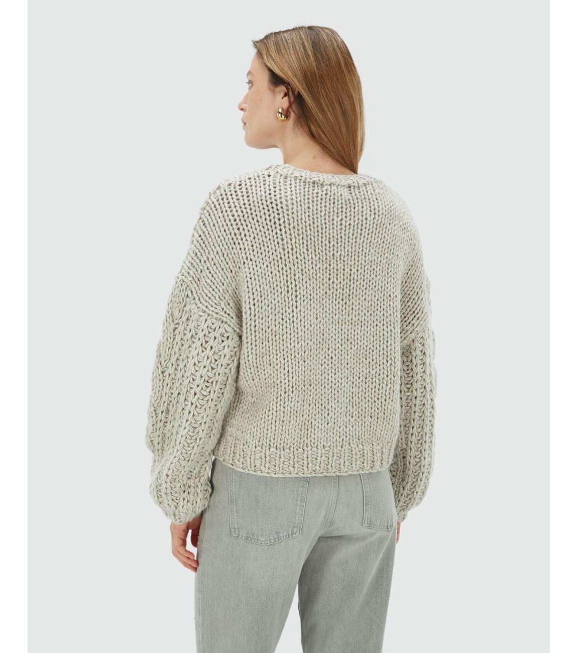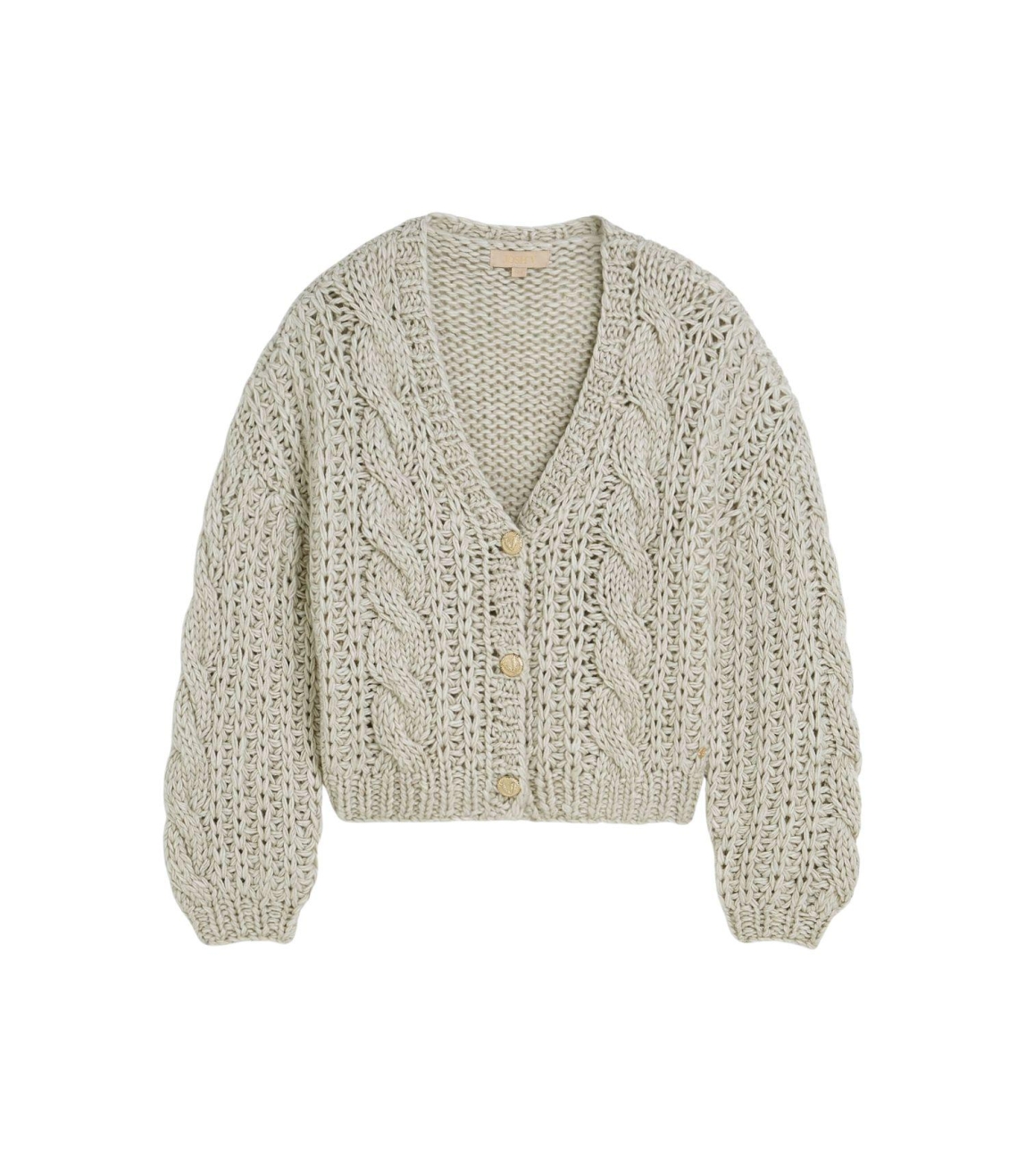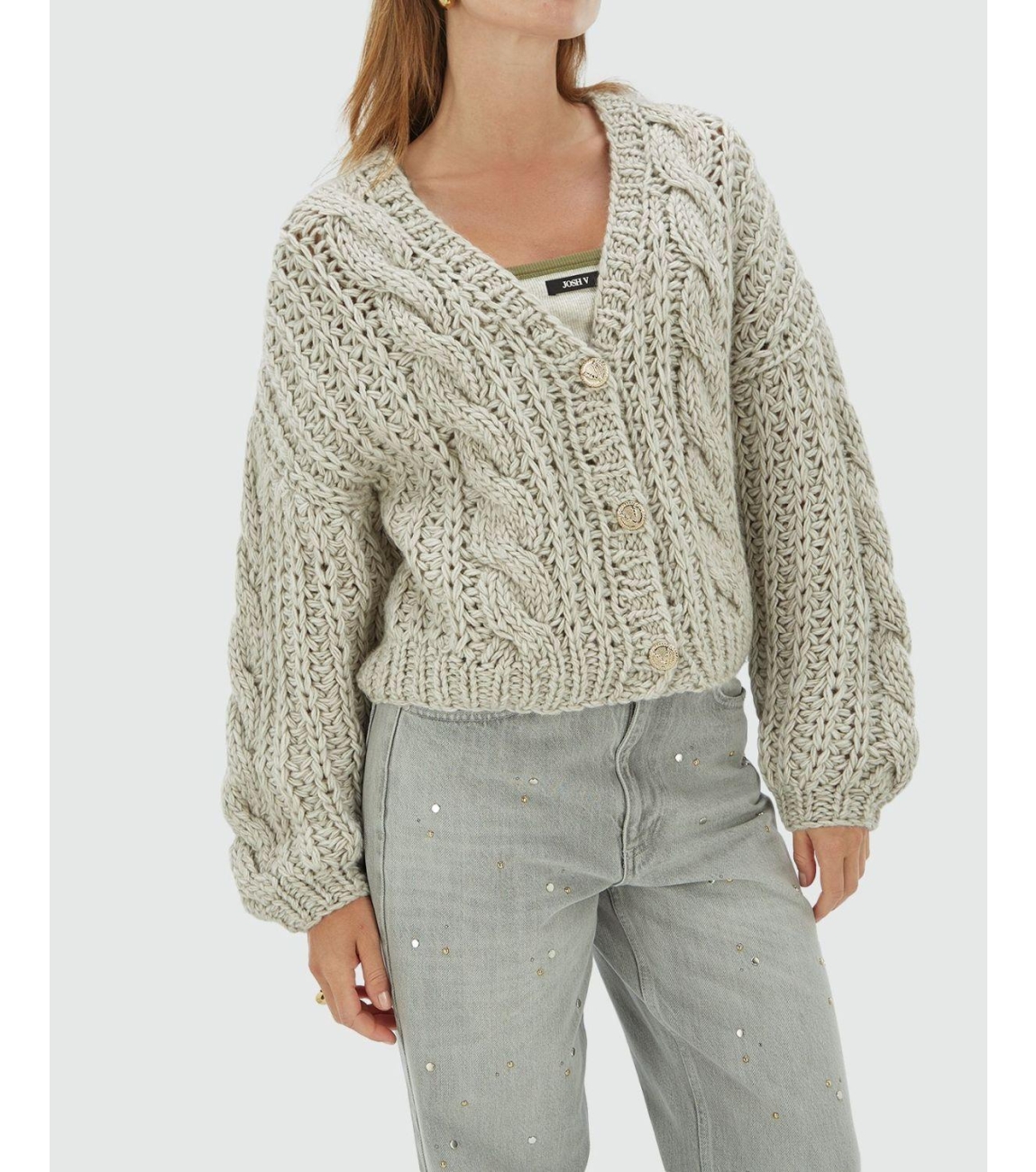 Josh V FAYENNA 214 warm grey melange. Dit wijdvallende model heeft een V-hals en lange ballonmouwen. Deze grijze kabelgebreide trui van Josh V sluit aan de voorzijde door middel van goudkleurige knopen.