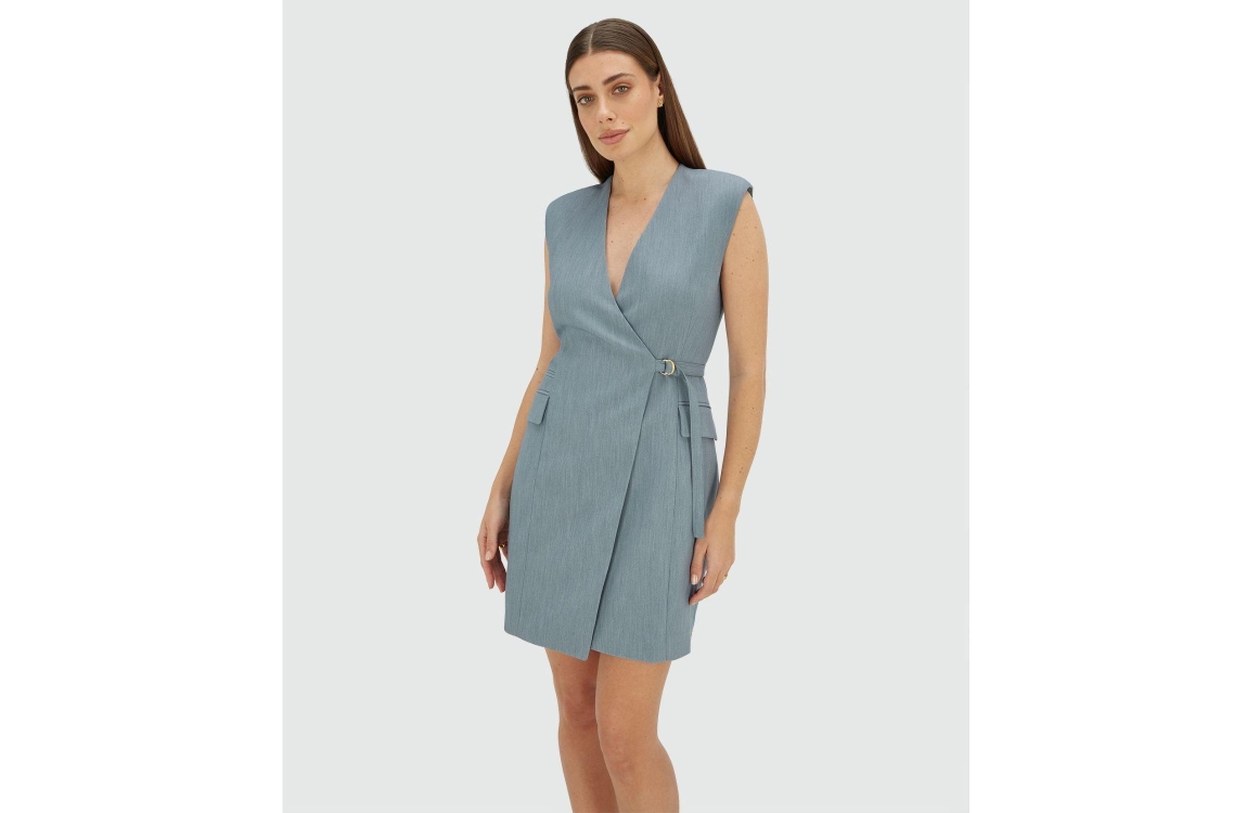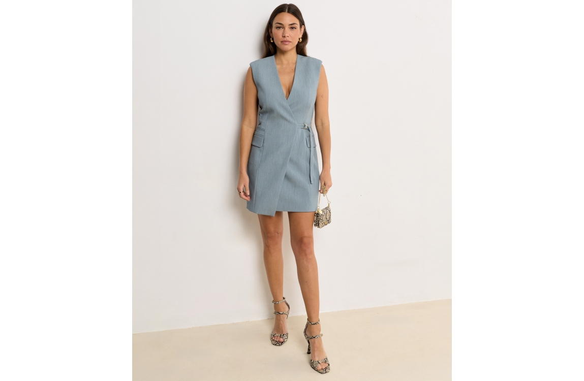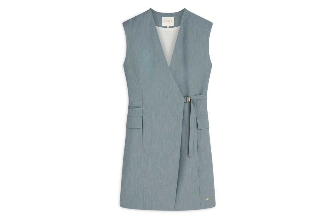 Josh V HENLEY wrap dress 625 sky blue melange. Dit aangesloten model is voorzien van een v-hals en is mouwloos. Deze blauwe blazerjurk van Josh V is afgewerkt met een ceintuur met gespsluiting waarmee de taille geaccentueerd wordt. Dit model heeft twee klepzakken aan de zijkanten.
