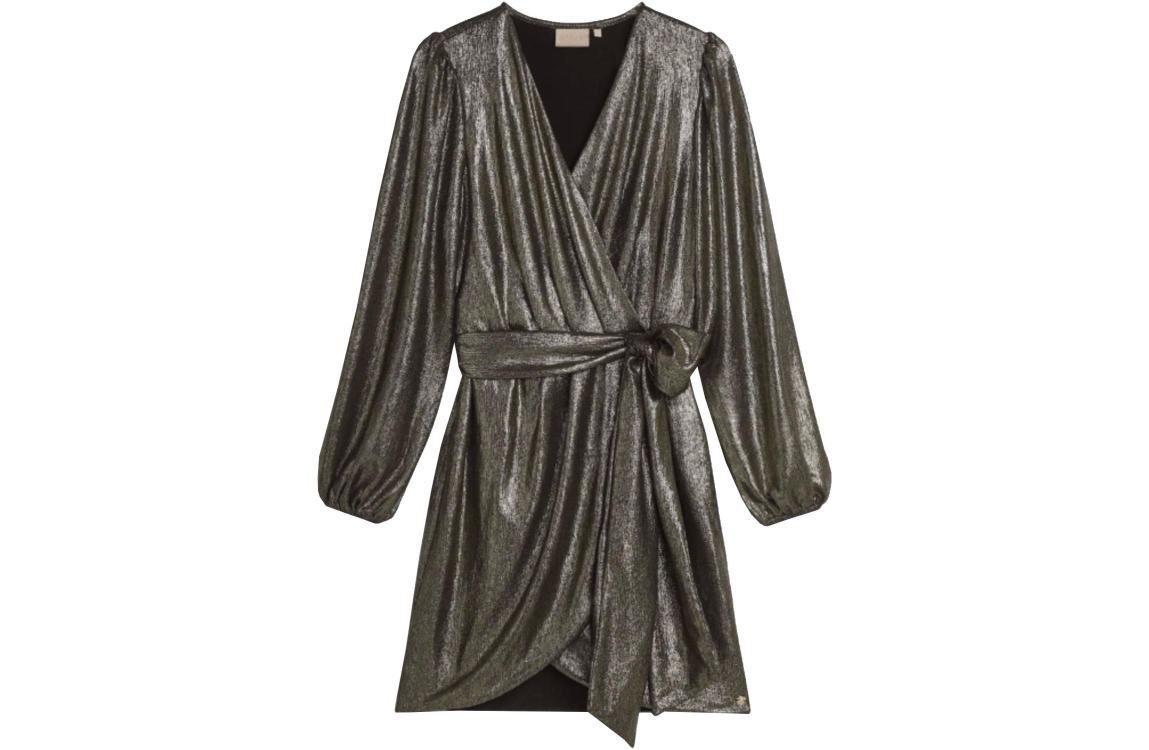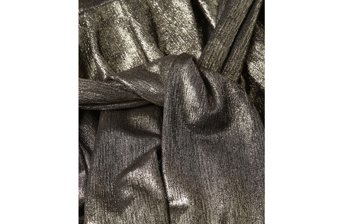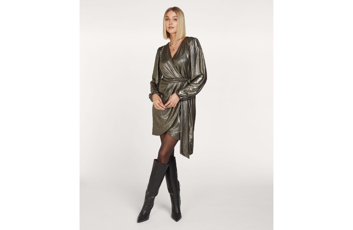 Josh V jurk Isabeau JV-2410-1401. Dit regular fit model heeft een V-hals en lange mouwen. Deze goudkleurige jurk van Josh V sluit door middel van een strikceintuur met ceintuurlussen en is all-over bewerkt met glitterdraden.