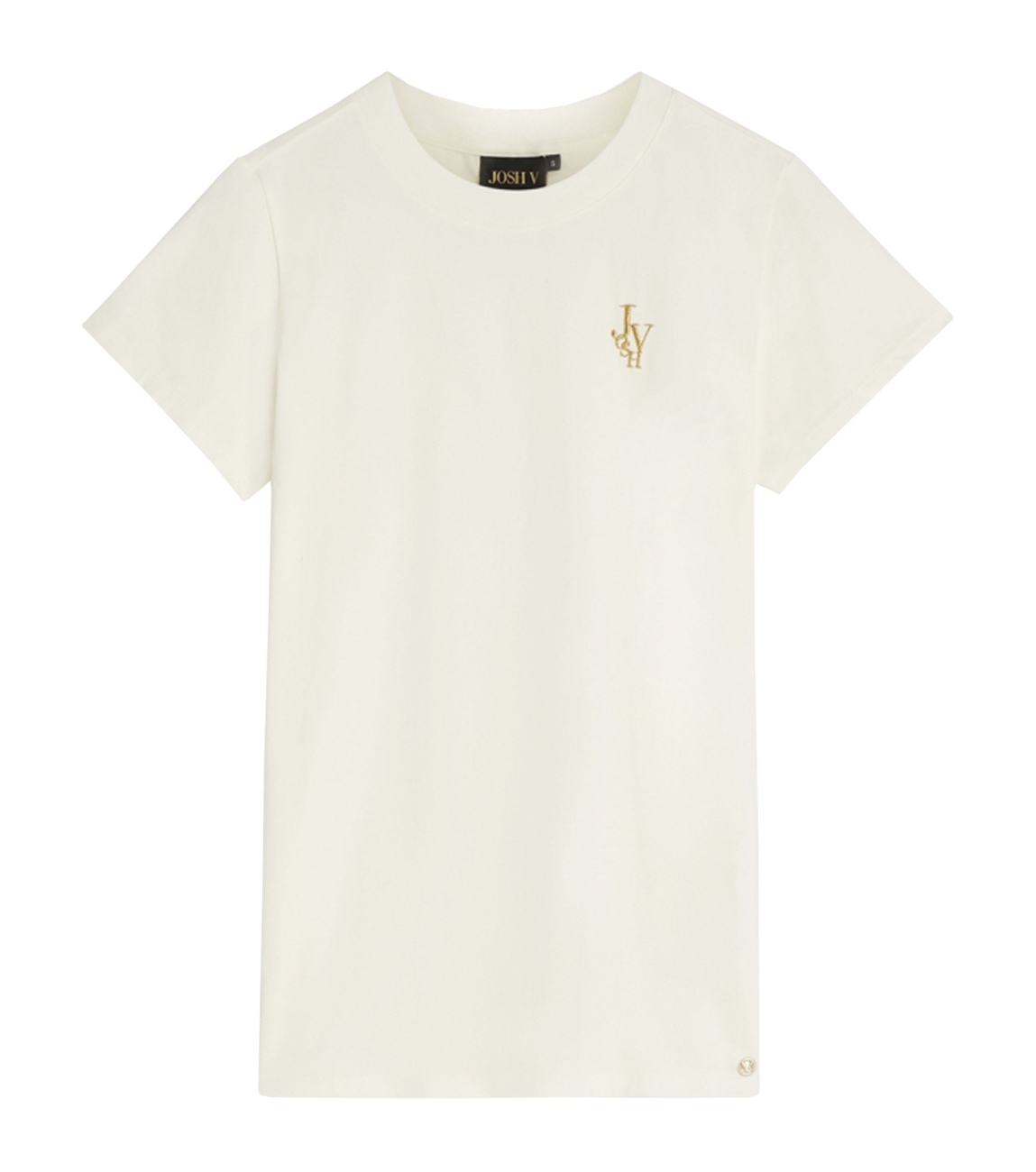 Josh V T-shirt Zoe JV-5000-0004. Dit rechtvallend model is voorzien van een ronde hals en heeft korte mouwen. Deze off white T-shirt van Josh V is bewerkt met een goudkleurige geborduurd merkopdruk aan de linker voorzijde.