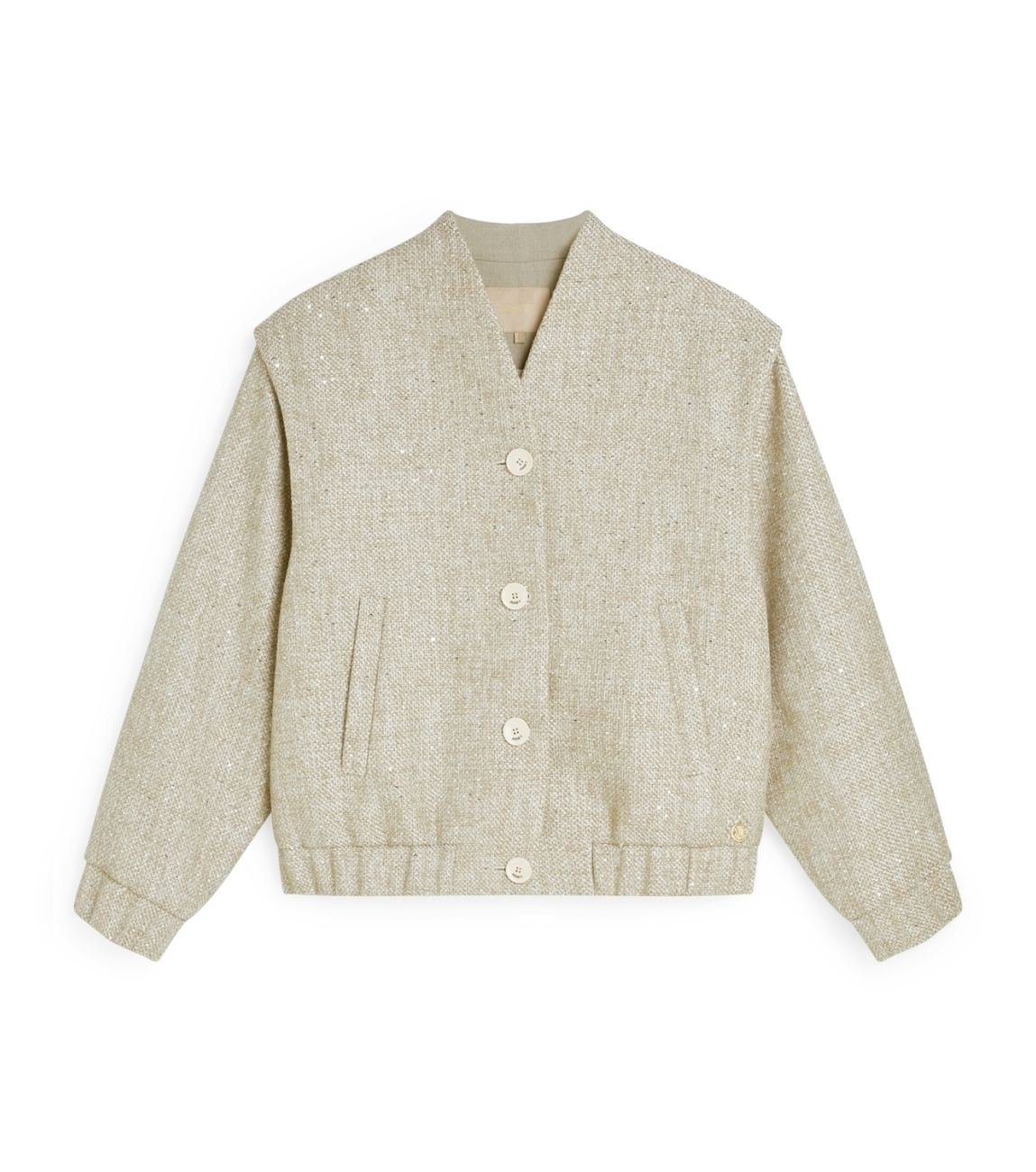 Josh V KELLIE JV-2508-0305 bomberjack. Dit oversized model heeft een v-hals en lange mouwen. Deze lichtbruine bomber van Josh V sluit door middel van knopen en is bewerkt met glitter. Dit stijlvolle model is voorzien van steekzakken.