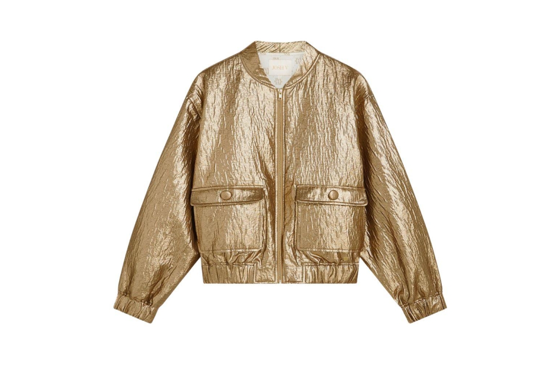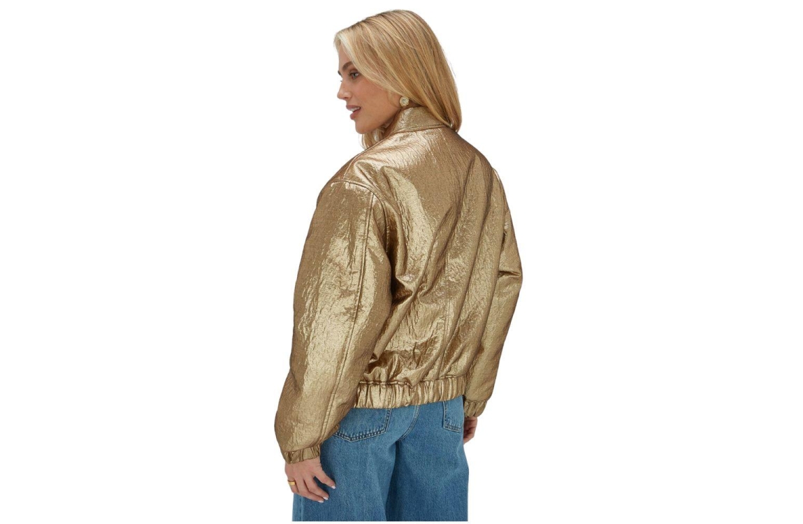 Josh V bomberjas Kelsey JV-2602-0901. Dit bomber model heeft een ronde halslijn en lange mouwen. Deze goudkleurige bomberjas van Josh V sluit aan de voorzijde door middel van een rits en is uitgevoerd in een metallic-look. Het model is voorzien van twee decoratieve klepzakken met steekzakken en is afgewerkt met een elastische zoom.