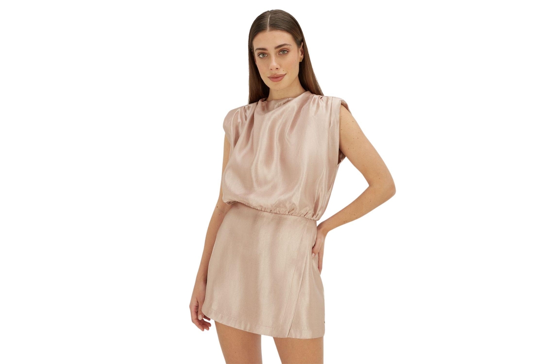 Josh V LIRA regular fit jumpsuit 813 dusty pink. Dit regular fit model heeft een watervalhalslijn en is voorzien van schoudervulling. Deze roze jumpsuit is uitgevoerd in een satijnen-look en sluit aan de achterzijde door middel van een rits.