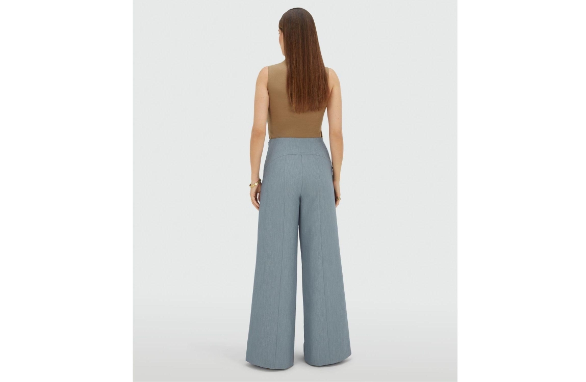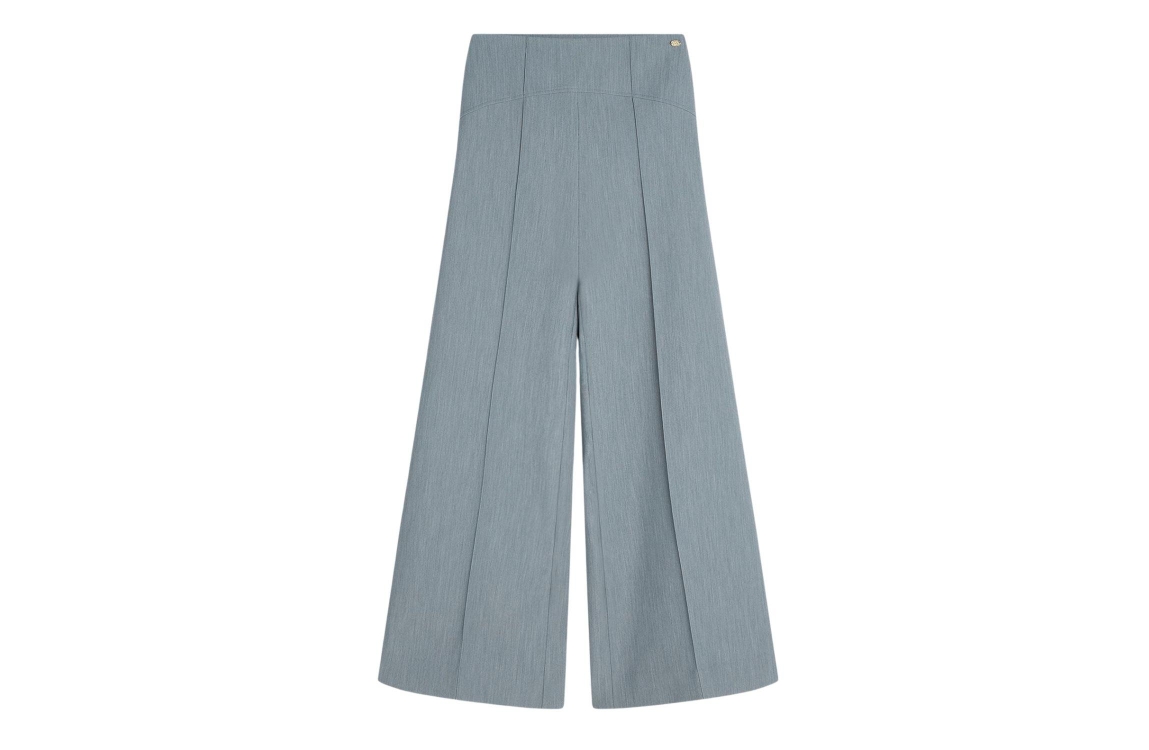 Josh V MICHELLA high-waisted wide leg trousers 625 sky blue melange. Dit wijdvallende model sluit door middel van een blinde ritssluiting aan de zijkant. Deze blauwe pantalon van Josh V valt high waisted.