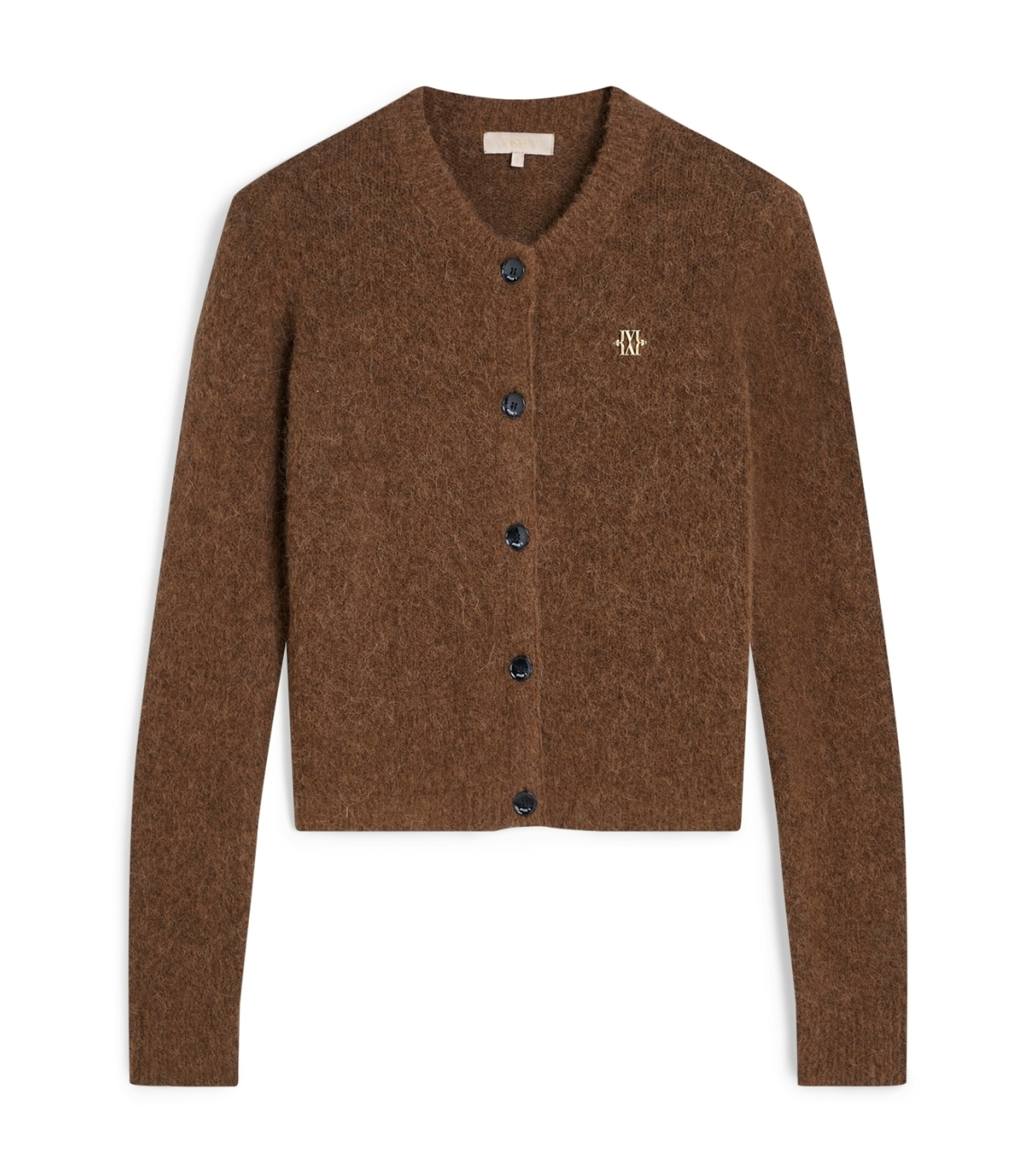 Josh V PAULINE 585 JV-2508-0201 vest. Dit regular fit model heeft een ronde hals en lange mouwen. Dit bruine vest van Josh V sluit door middel van knopen en beschikt over een gouden detail op het voorpand.
