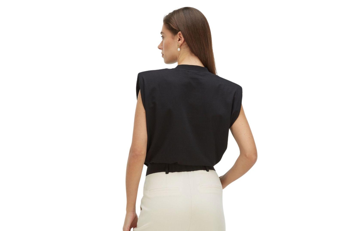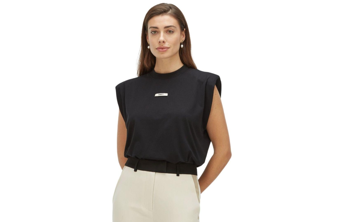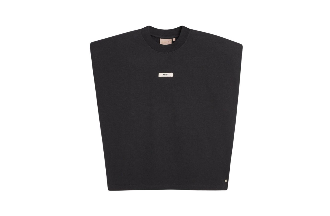 Josh V top Sue JV-2501-1111-300. Dit wijdvallend model heeft een ronde hals en is mouwloos. Deze zwarte top van Josh V is aan de voorzijde bewerkt met het JOSH V-logo en is voorzien van schoudervulling.