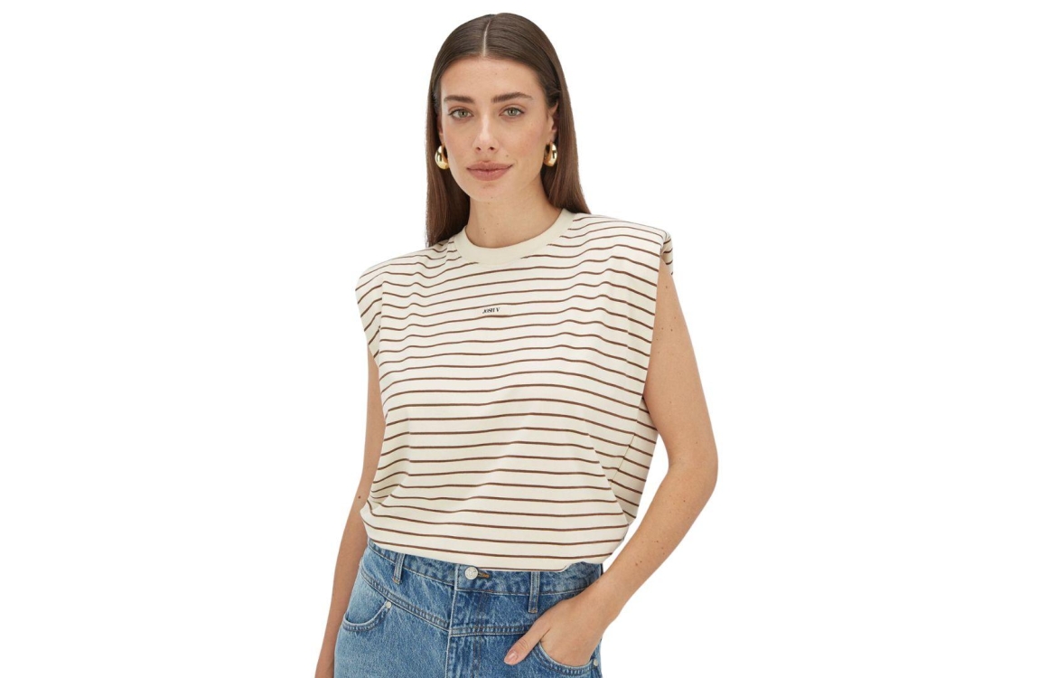 Josh V top Sue JV-2508-1101. Dit rechtvallend model heeft een ronde hals en is mouwloos. Deze créme kleurige top van Josh V is aan de voorzijde bewerkt met het JOSH V-logo en is voorzien van schoudervulling. Dit model is bewerkt met bruine strepen.