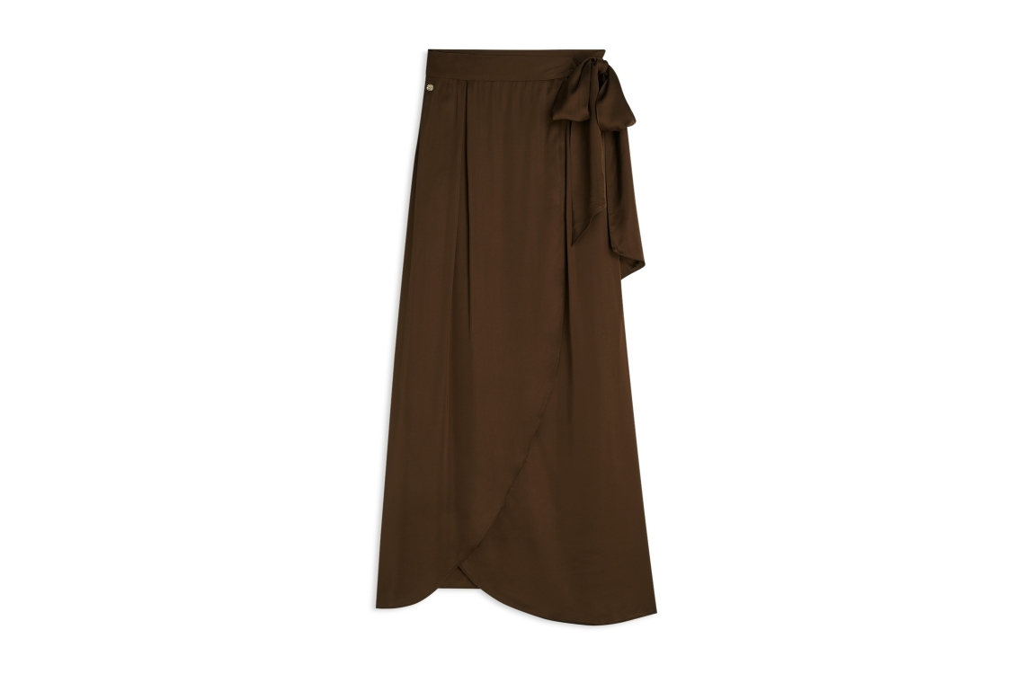 Josh V rok Yamicia JV-2603-0508. Dit maxi model sluit door middel van een wikkelsluiting met strikdetail. Deze donkerbruine rok van Josh V is uitgevoerd in een satijnen-loon en is voorzien van twee steekzakken aan de voorzijde.