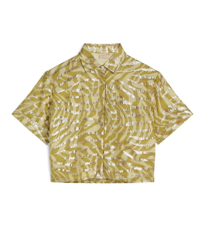Josh V blouse Ziya 2504-0107. Dit rechtvallende model is voorzien van een kraag, korte mouwen en sluit door middel van knopen. Deze groene blouse van Josh V is een cropped blouse. Dit model is all-over bewerkt met gouden details.