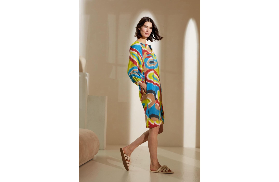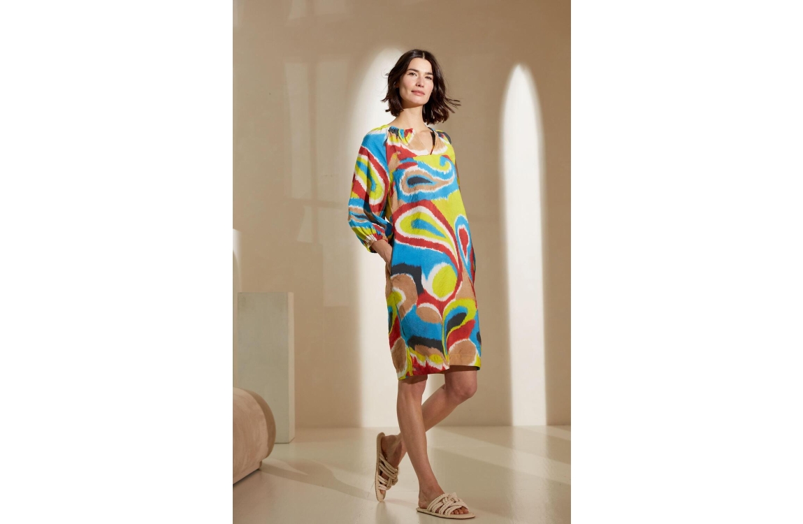 Kyra jurk Esmee-s24. Dit rechtvallend model heeft lange ballonmouwen en een V-hals. Deze multi-colour jurk van Kya & Ko is all-over bewerkt met een grafische print in verschillende kleuren. De jurk beschikt over een ceintuur en ceintuurlussen.