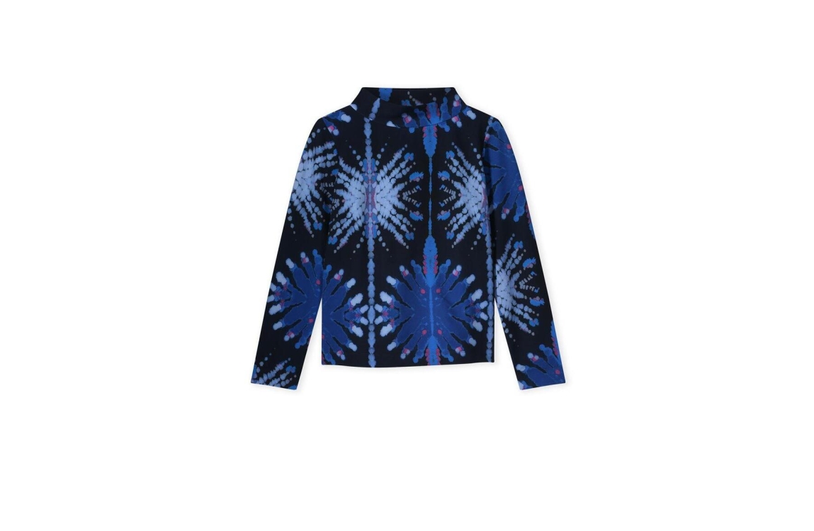 Kyra top jean. Dit rechtvallend model is voorzien van een turtle neck en heeft lange mouwen. Deze blauwe top van Kyra is all-over bewerkt met een print.
