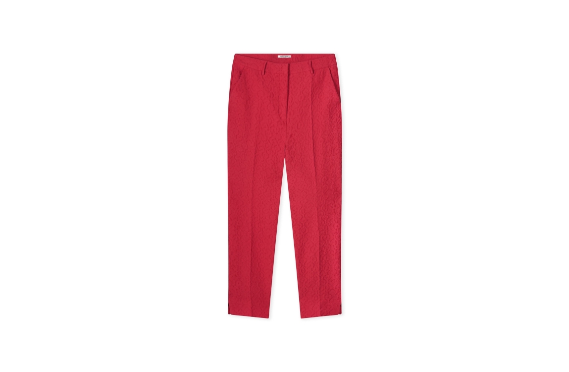 Kyra broek Sam. Dit slim fit model sluit door middel van een haaksluiting en een rits afgewerkt met ceintuurlussen. Deze rode gestructureerde broek van Kyra is aan de onderzijde afgewerkt met splitjes.