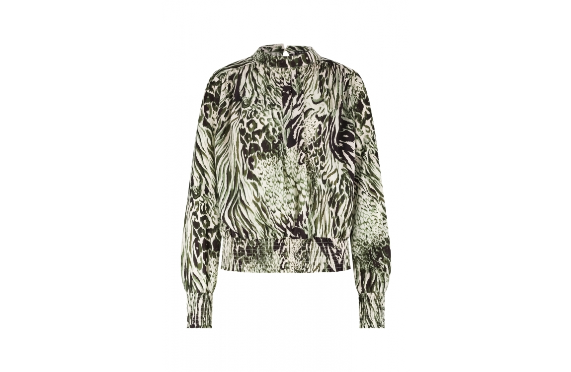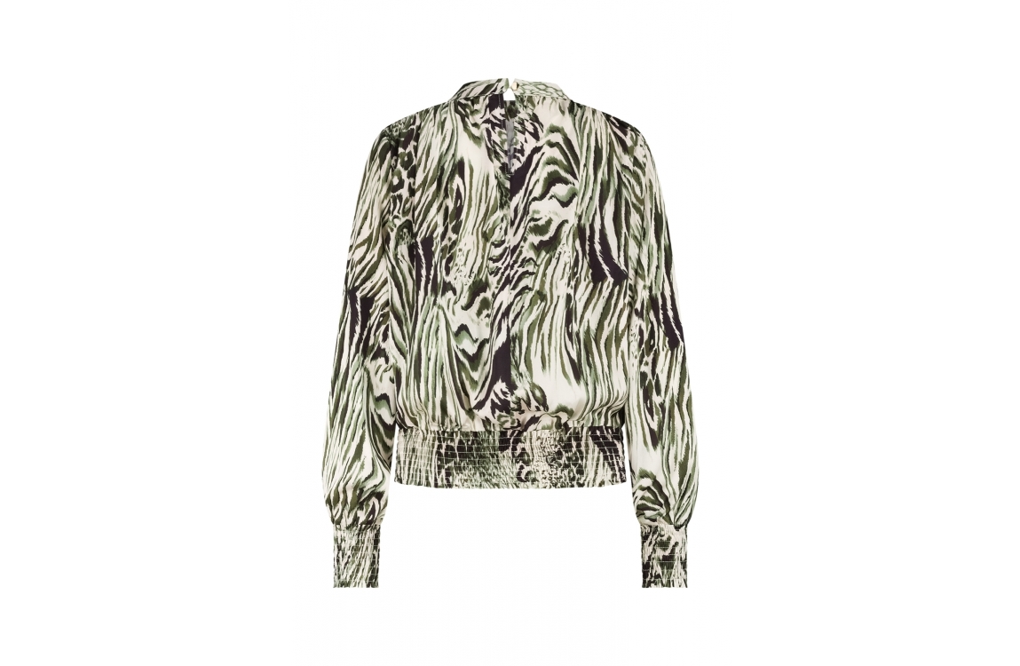 Label Dot blouse Abby 2521004. Dit rechtvallend model is voorzien van een ronde hals en heeft lange mouwen. Deze groen/witte/bruine blouse van Label Dot is bewerkt met een print en is afgewerkt met elastische boorden. Dit model sluit door middel van knoopjes aan de achterzijde.