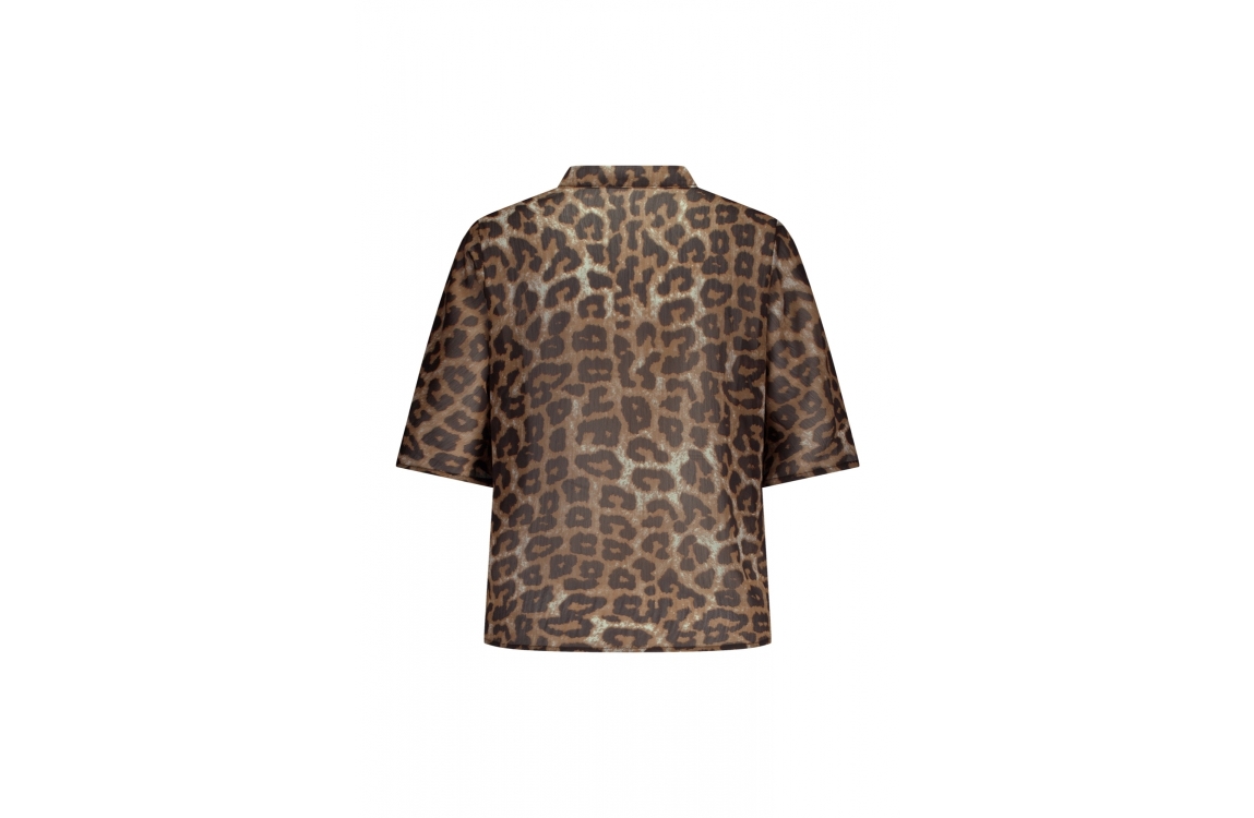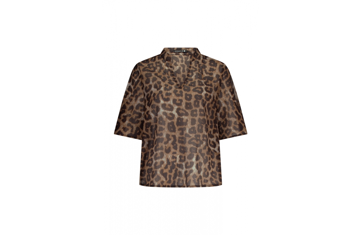 Label Dot top Aline 2511026. Dit rechtvallend model is voorzien van een ronde hals met v-inkeping en heeft korte sierlijke mouwen. Deze zwarte/bruine top van Label Dot is bewerkt met panterprint en is doorschijnend.