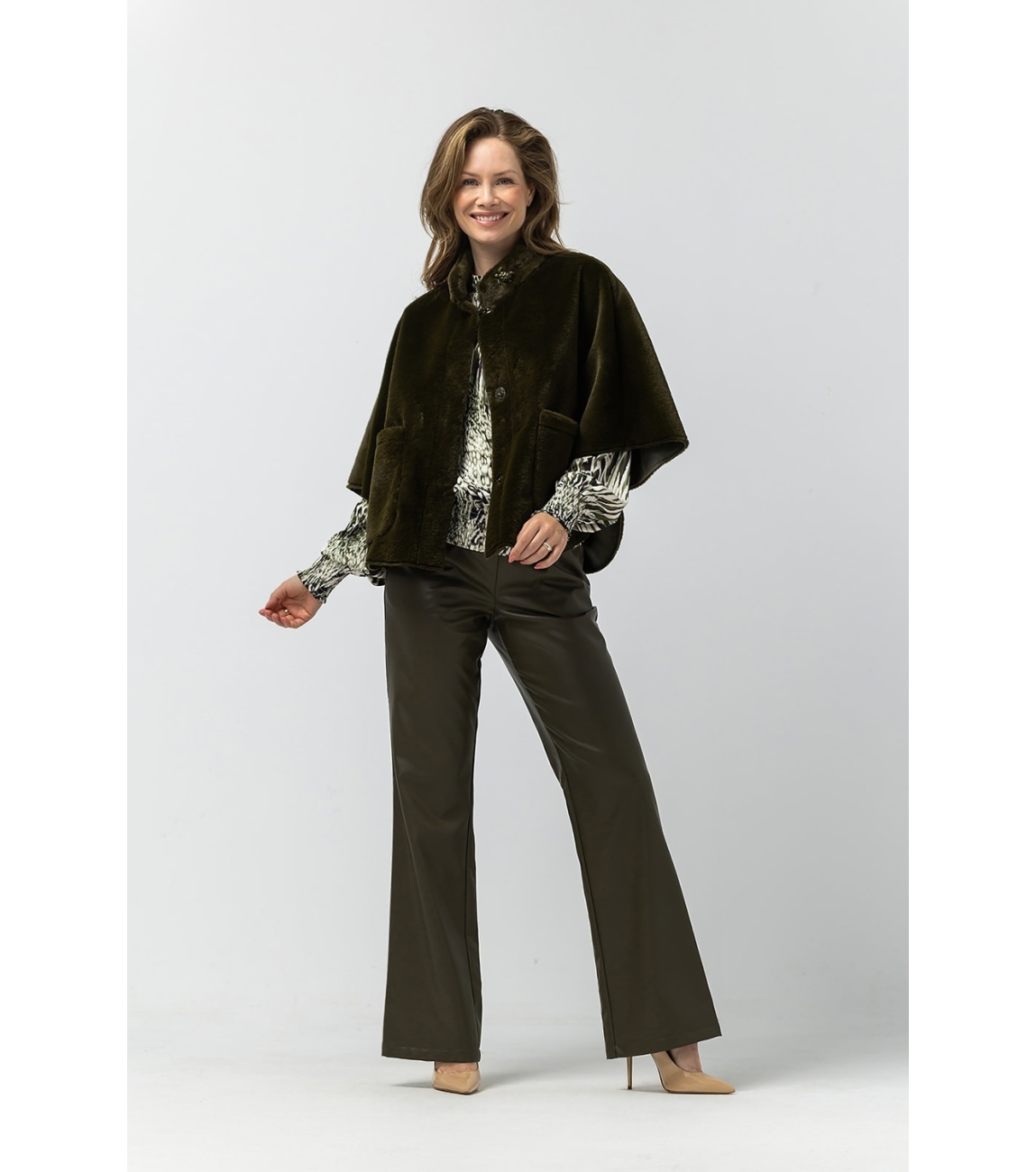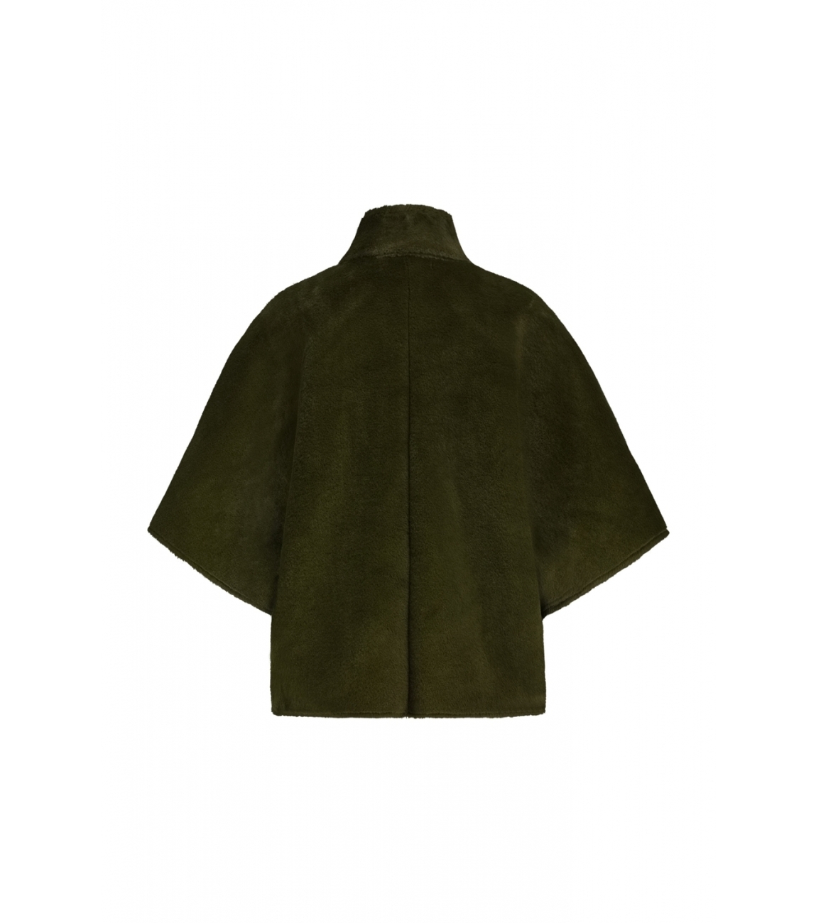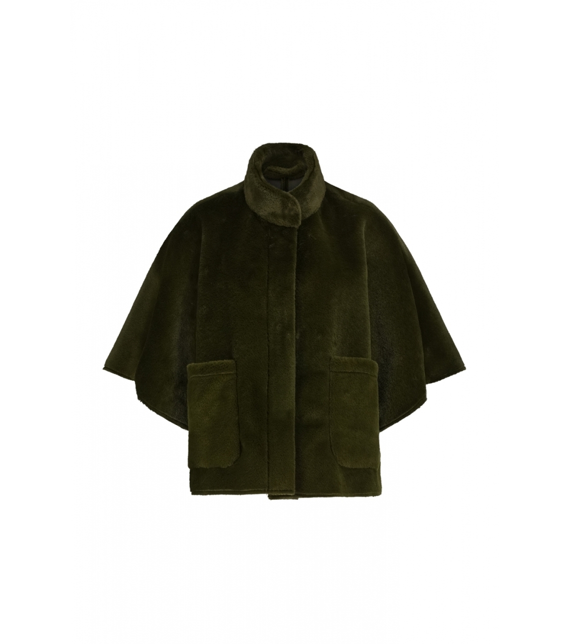 Label Dot jasje Dana 2527003. Dit wijdvallend model is voorzien van een opstaande ronde kraag en heeft driekwart mouwen. Deze groene faux fur cape van Label Dot sluit door middel van knopen, ook bij de mouwen en beschikt over twee opgestikte zakken.
