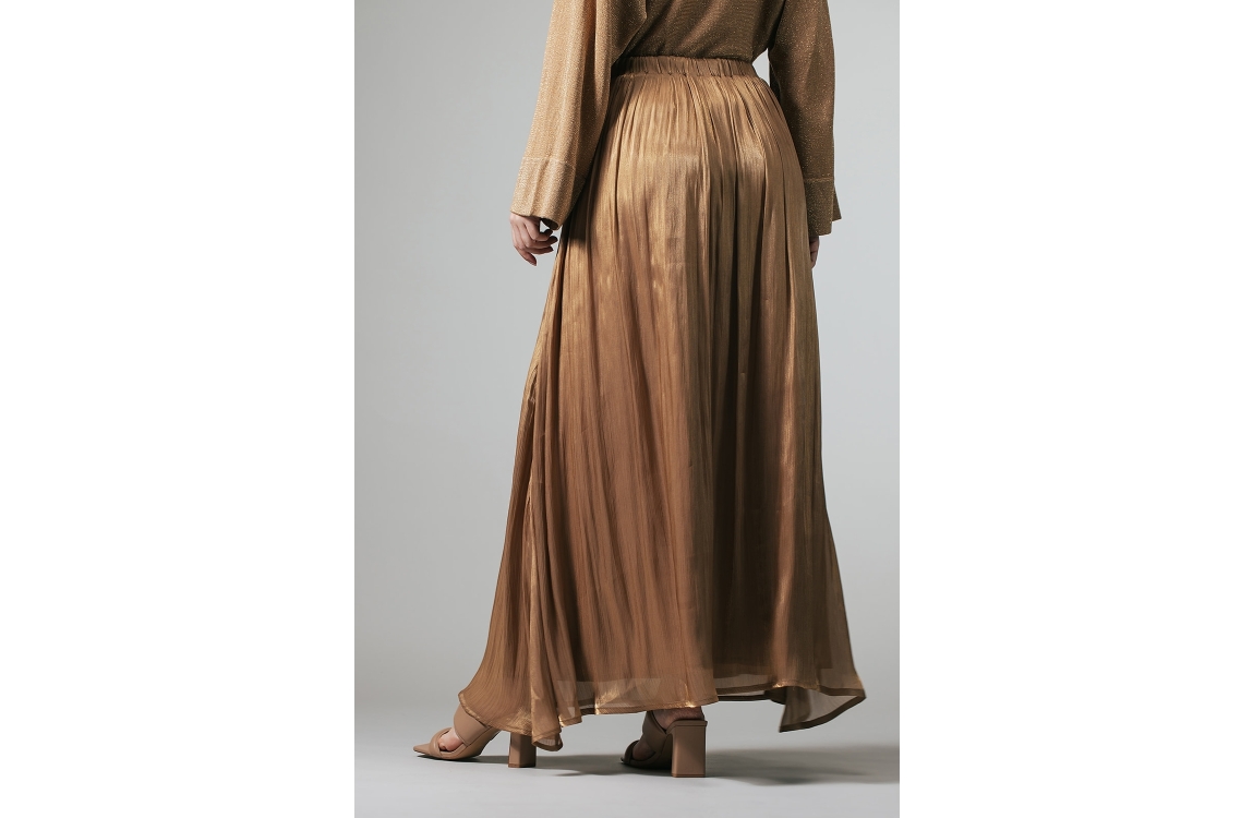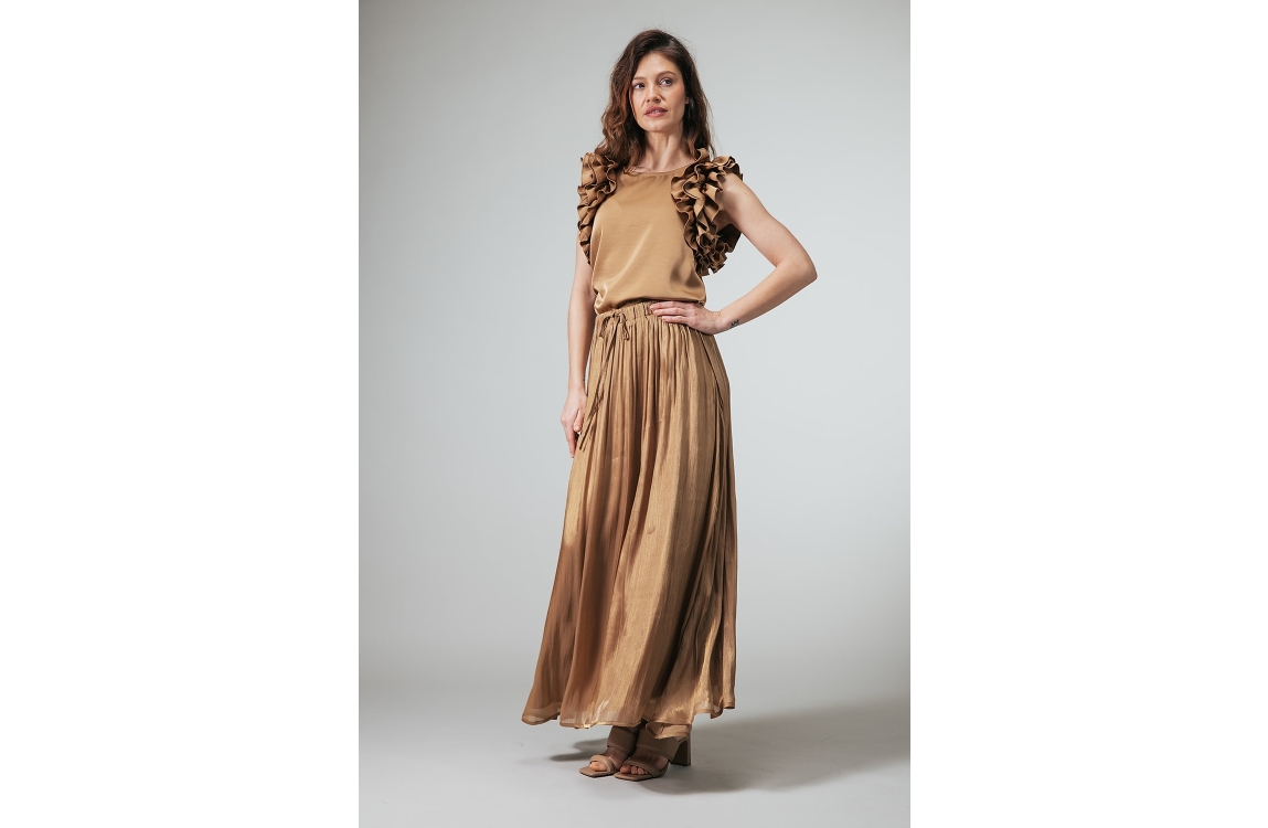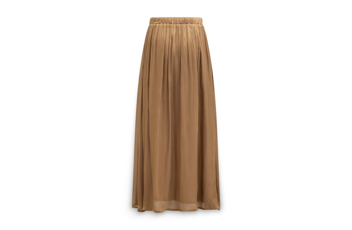 Label Dot Emi 250 goud. Dit rechtvallende model is voorzien van een elastische boord met striksluiting. Deze bruine maxi-rok van Label Dot is bewerkt met een prachtige glans en beschikt over een voering.