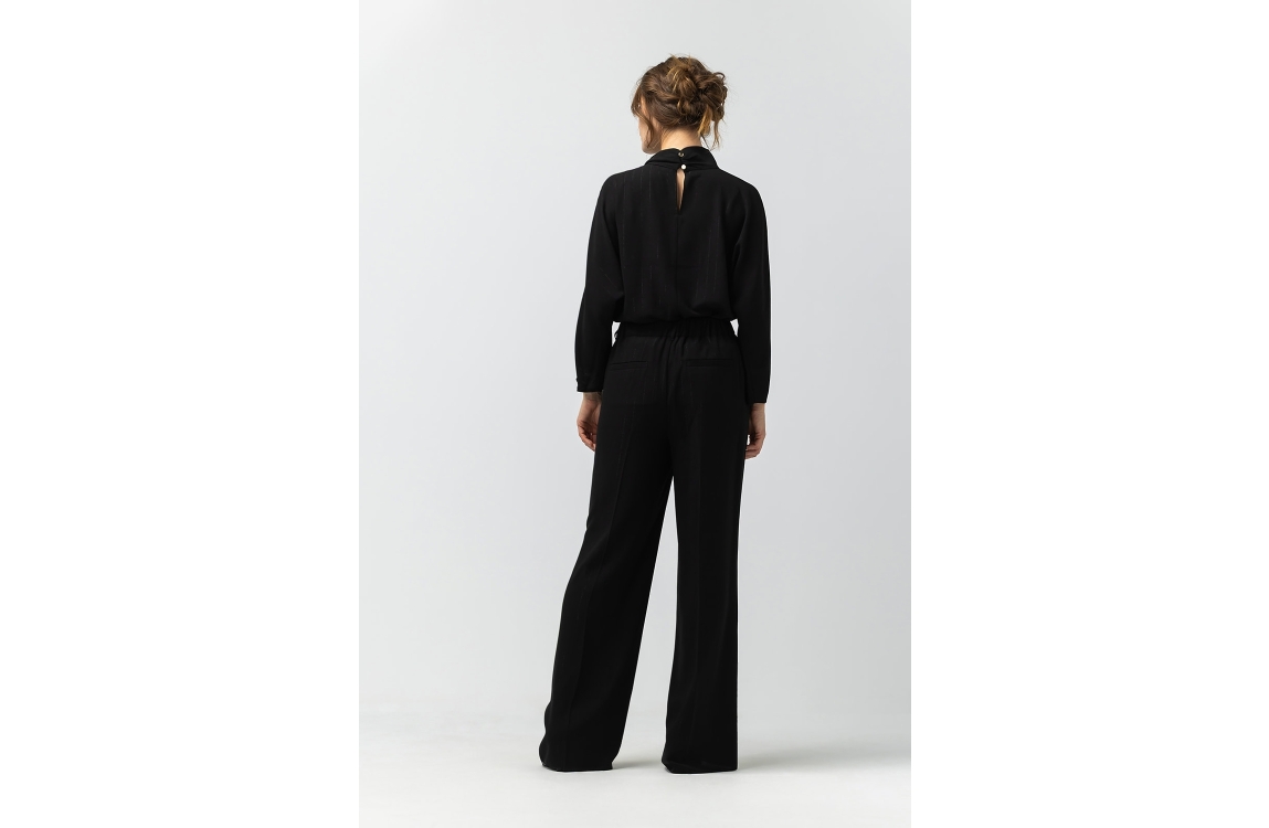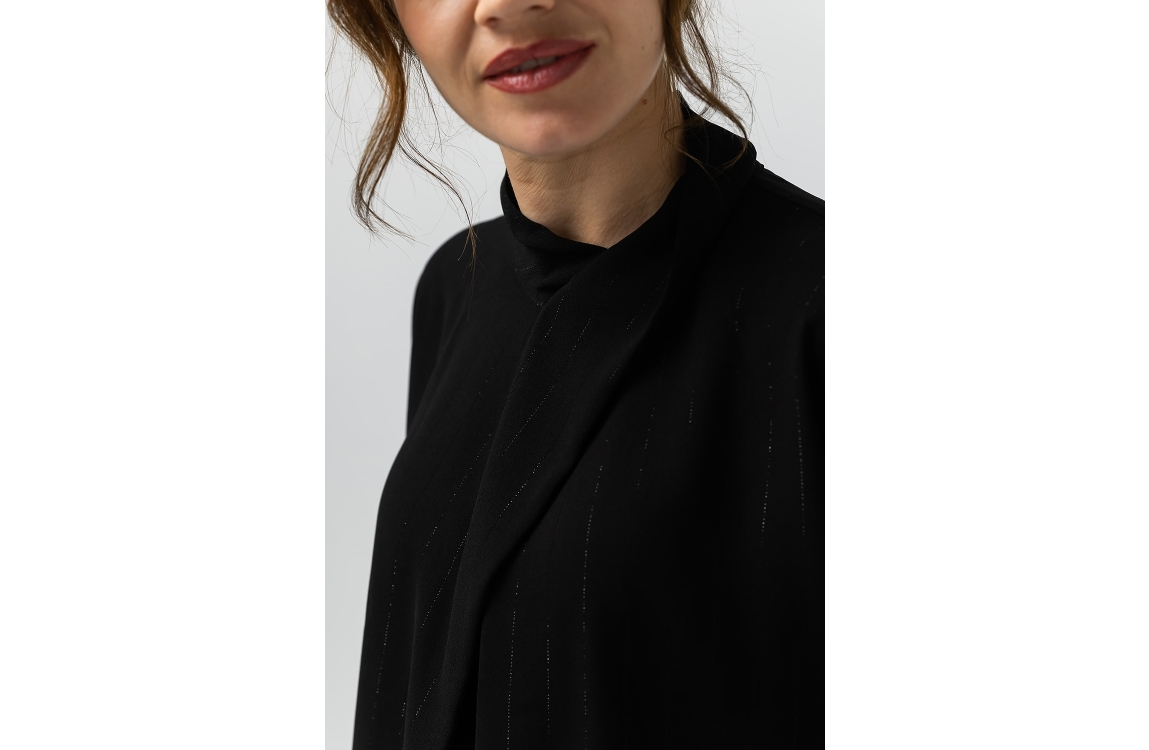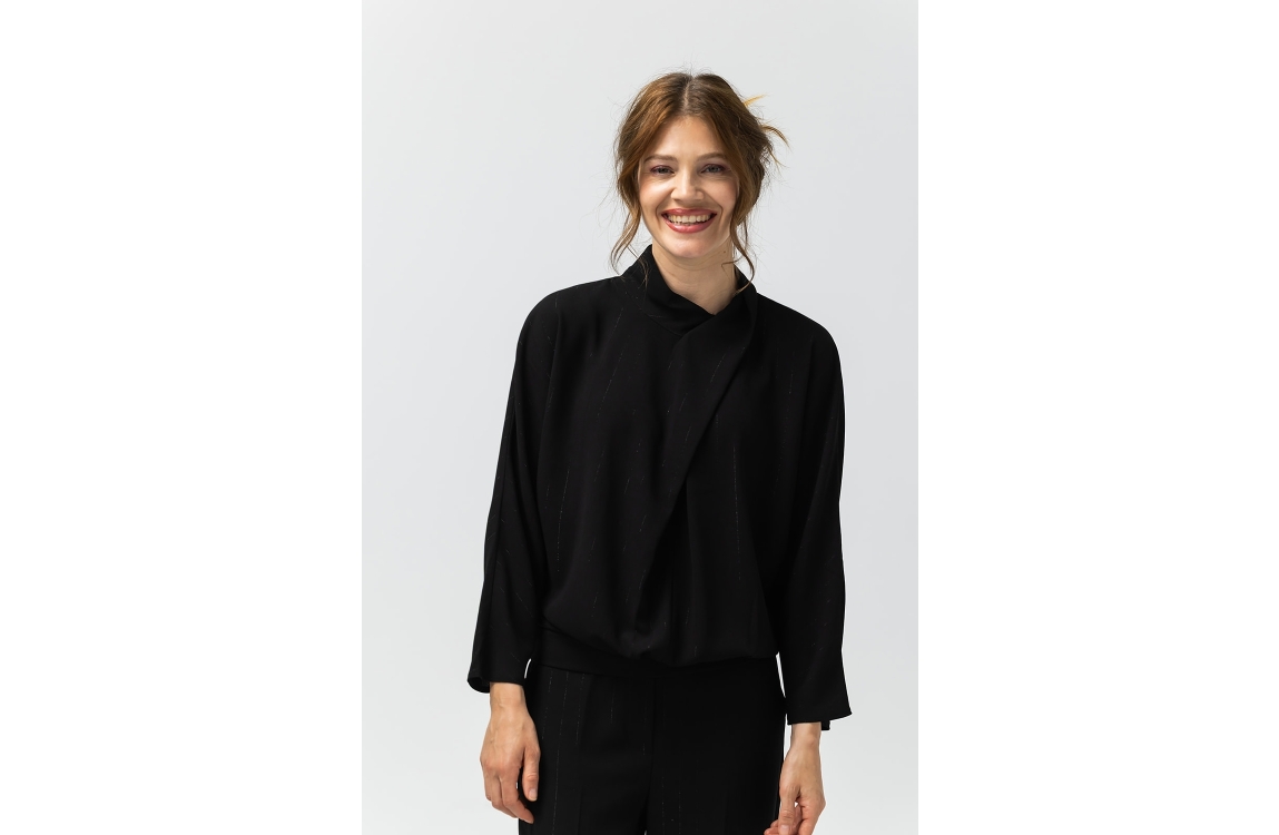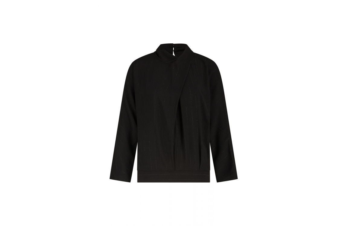 Label Dot blouse Malin 2525005. Dit rechtvallend model is voorzien van een hoge ronde hals afgewerkt met ene overslag detail en heeft lange mouwen. Deze zwarte blouse van Label Dot sluit aan de achterzijde door middel van knoopjes en is all-over bewerkt met een lurexdraadje.