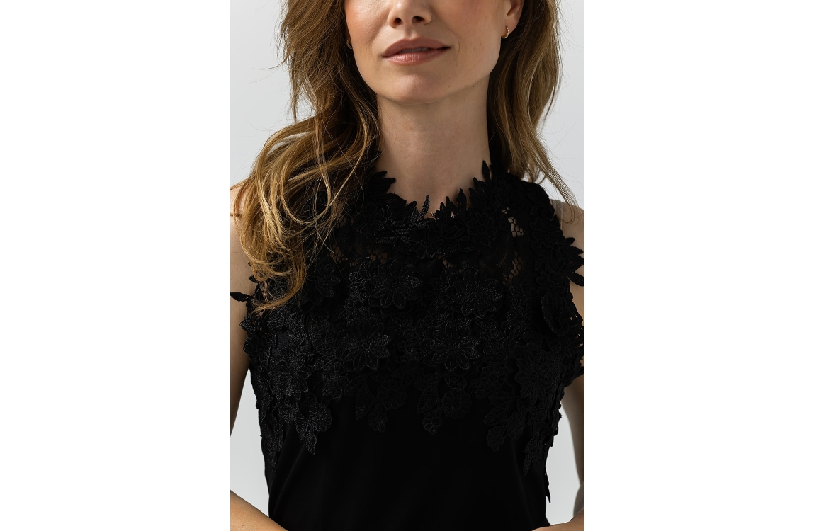 Label Dot top Margo. Dit rechtvallend model is voorzien van een ronde hals en is mouwloos. Deze zwarte top van Label Dot sluit aan de achterzijde door middel van een knoopje en is aan de bovenzijde bewerkt met kant.