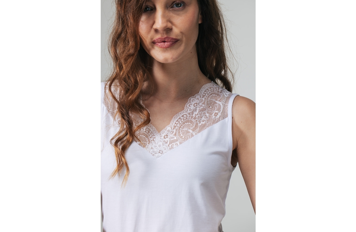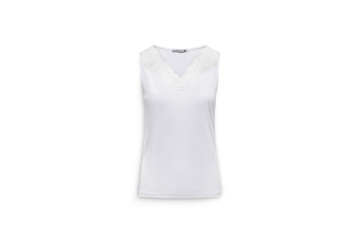 Label Dot top Max 2615008. Dit rechtvallend model is voorzien van een v-hals en is mouwloos. Deze witte top van Label Dot is bij de hals bewerkt met kant.