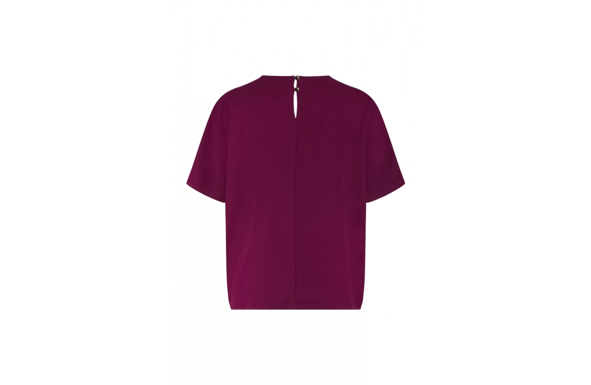 Label Dot shirt Mea. Dit wijdvallend model is voorzien van een hoge ronde hals en heeft korte mouwen. Deze bordeaux kleurige shirt van Label Dot sluit aan de achterzijde door middel van een knoopje.
