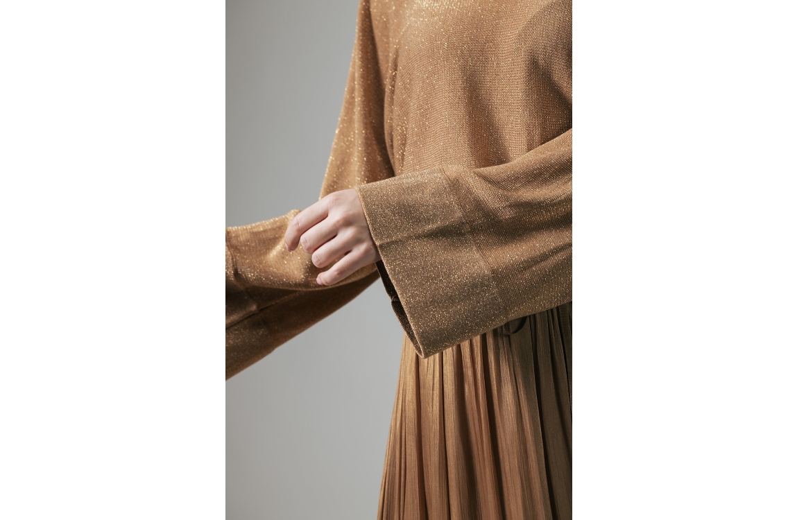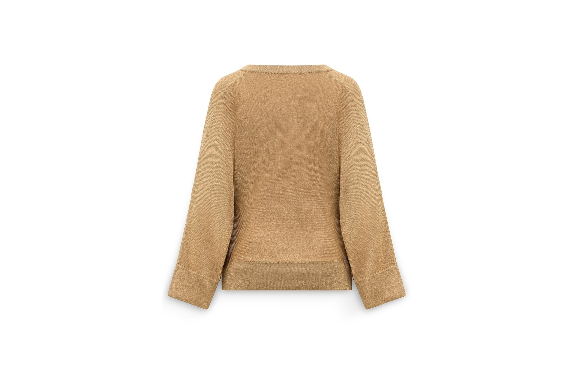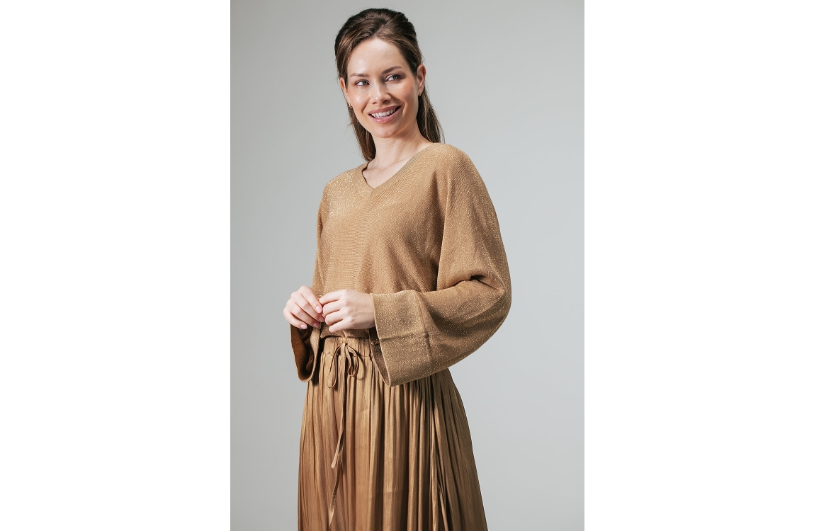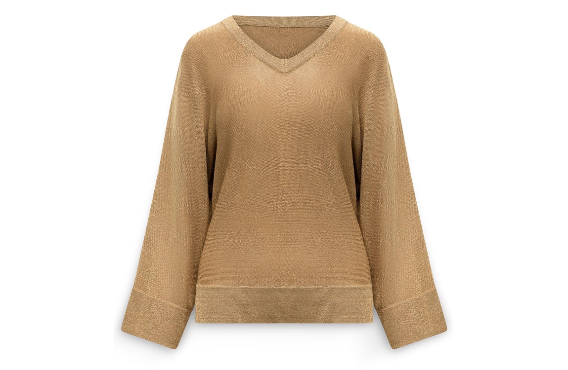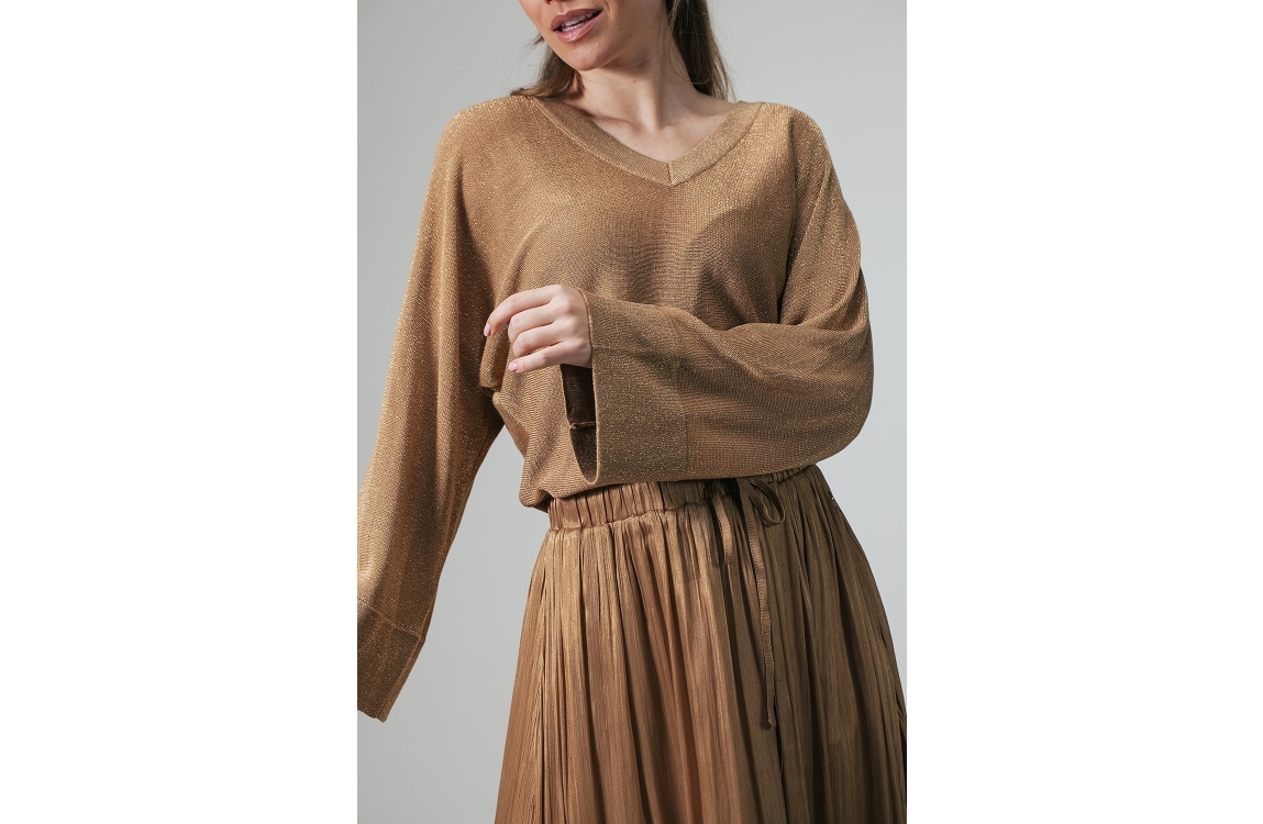 Label Dot Nop 229 beige. Dit wijdvallende model is voorzien van een v-hals en wijde lange mouwen. Deze bruine pullover van Label Dot is all-over bewerkt met een lurex draad.